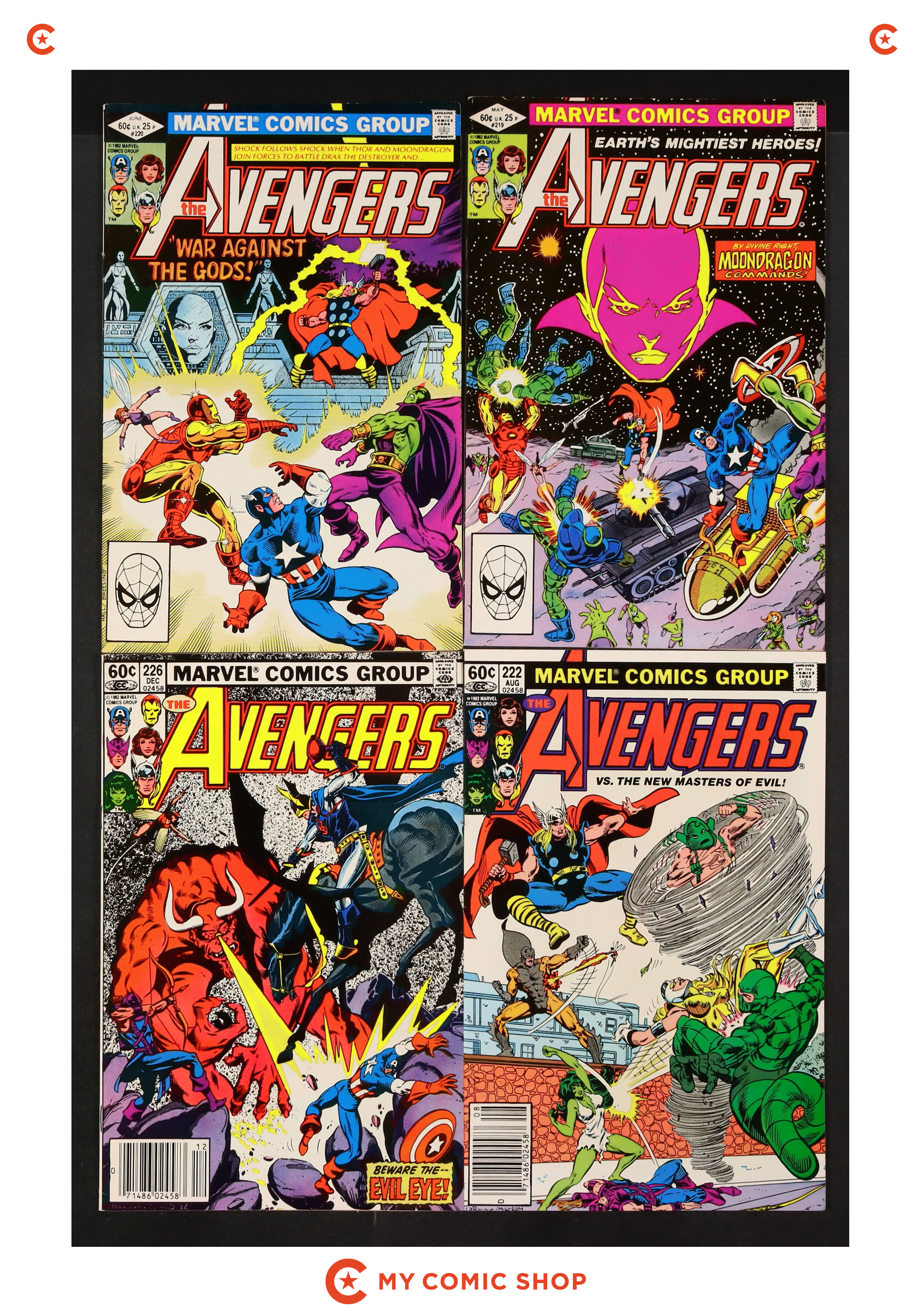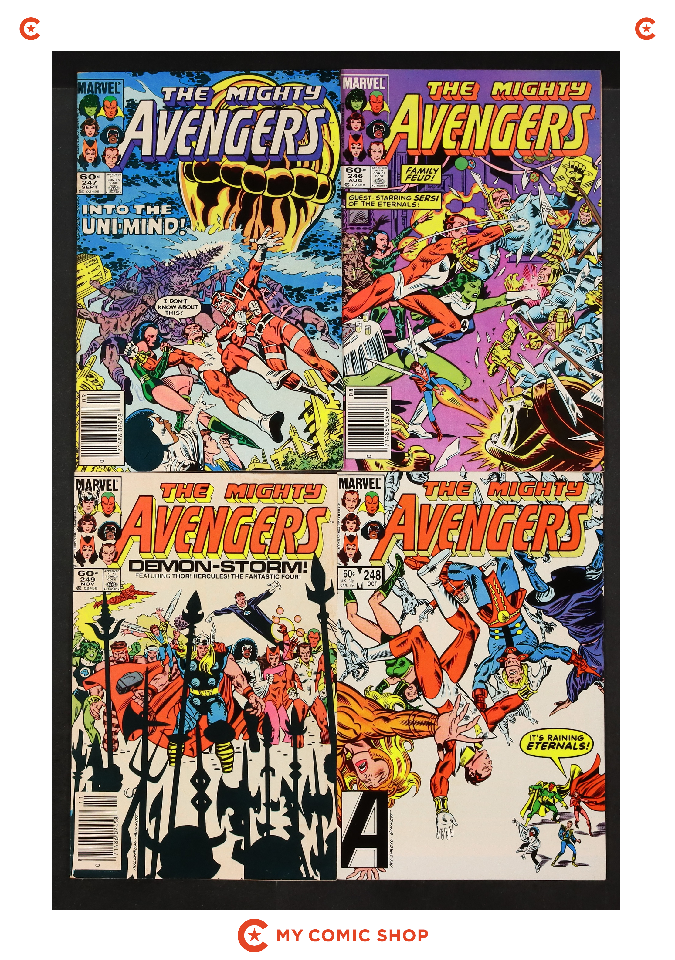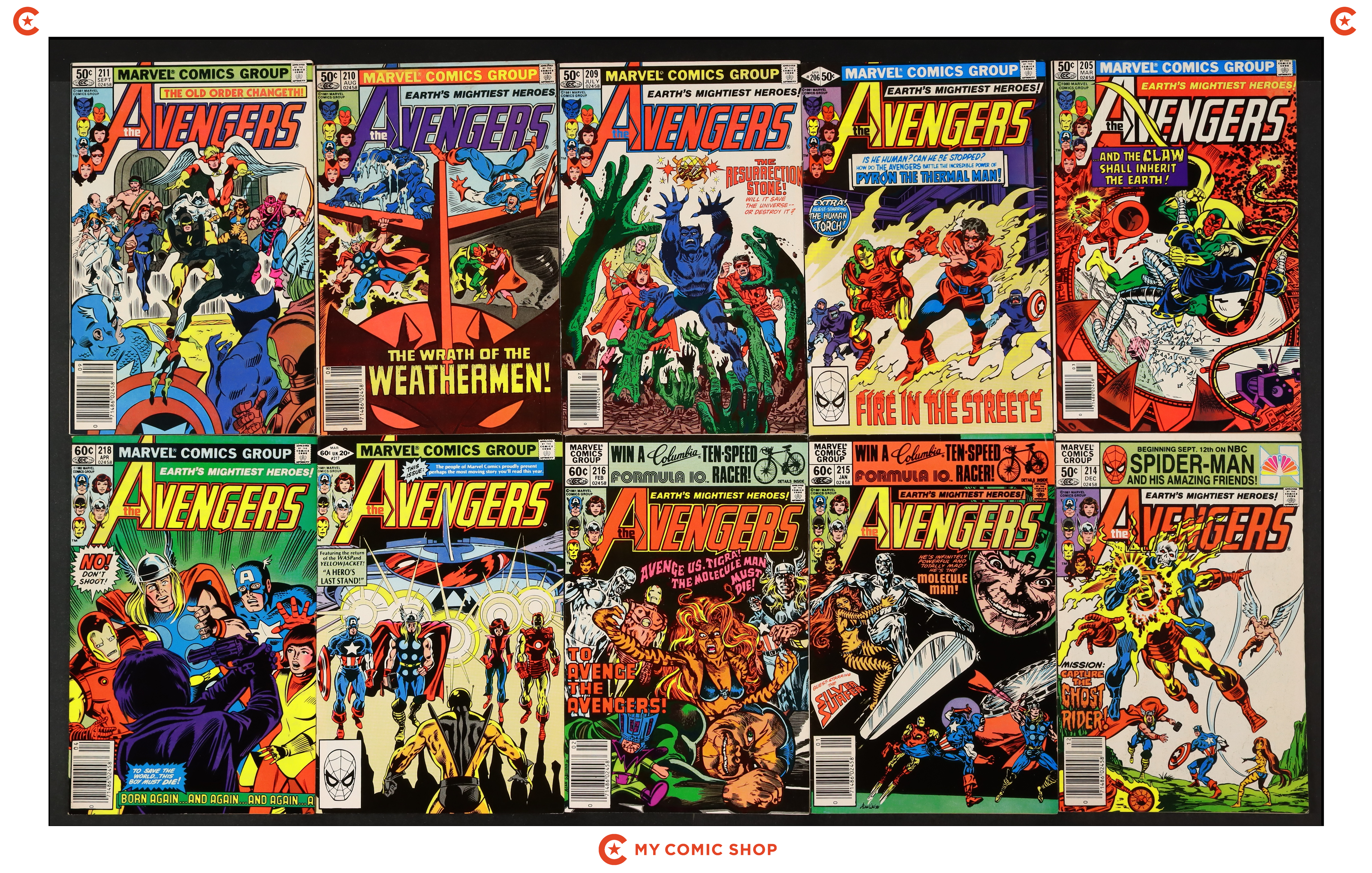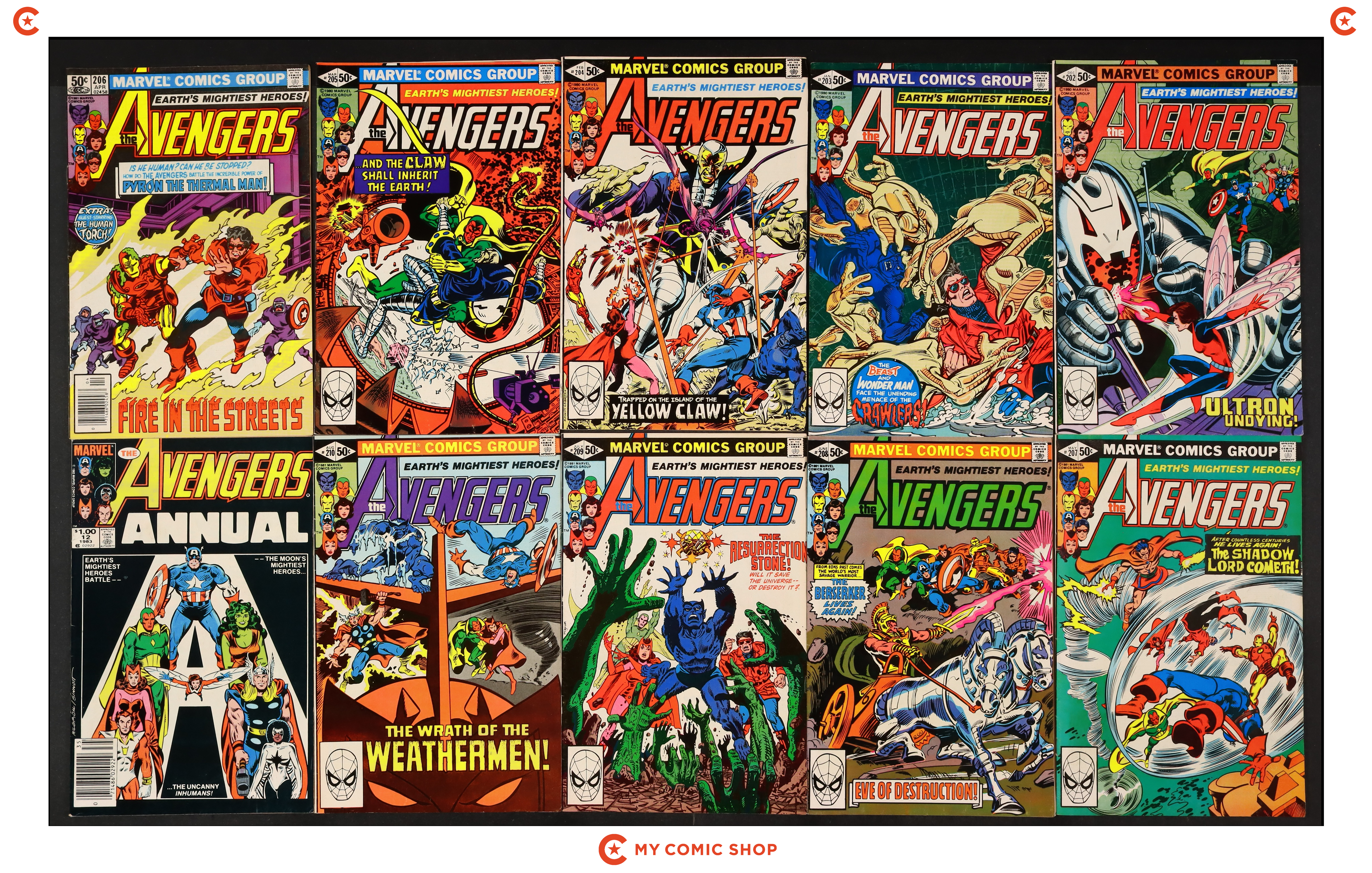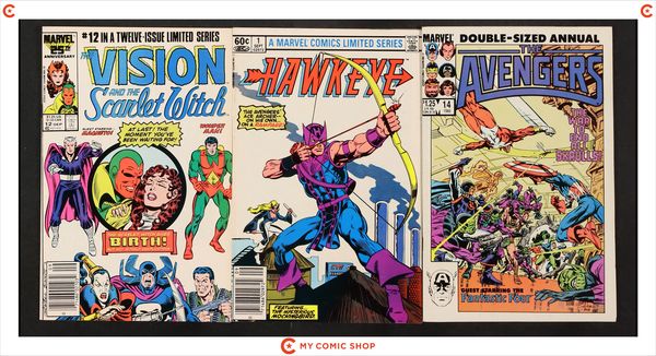 Issues 202D, 203D, 204D, 205D, 206N, 207, 208, 209, 210; plus Annual 12, 14 of Avengers (1963 1st Series); Hawkeye (1983 1st Series) 1N; and Vision and the Scarlet Witch (1985 2nd Series) 12. Most will grade in the VG to FN/VF range.