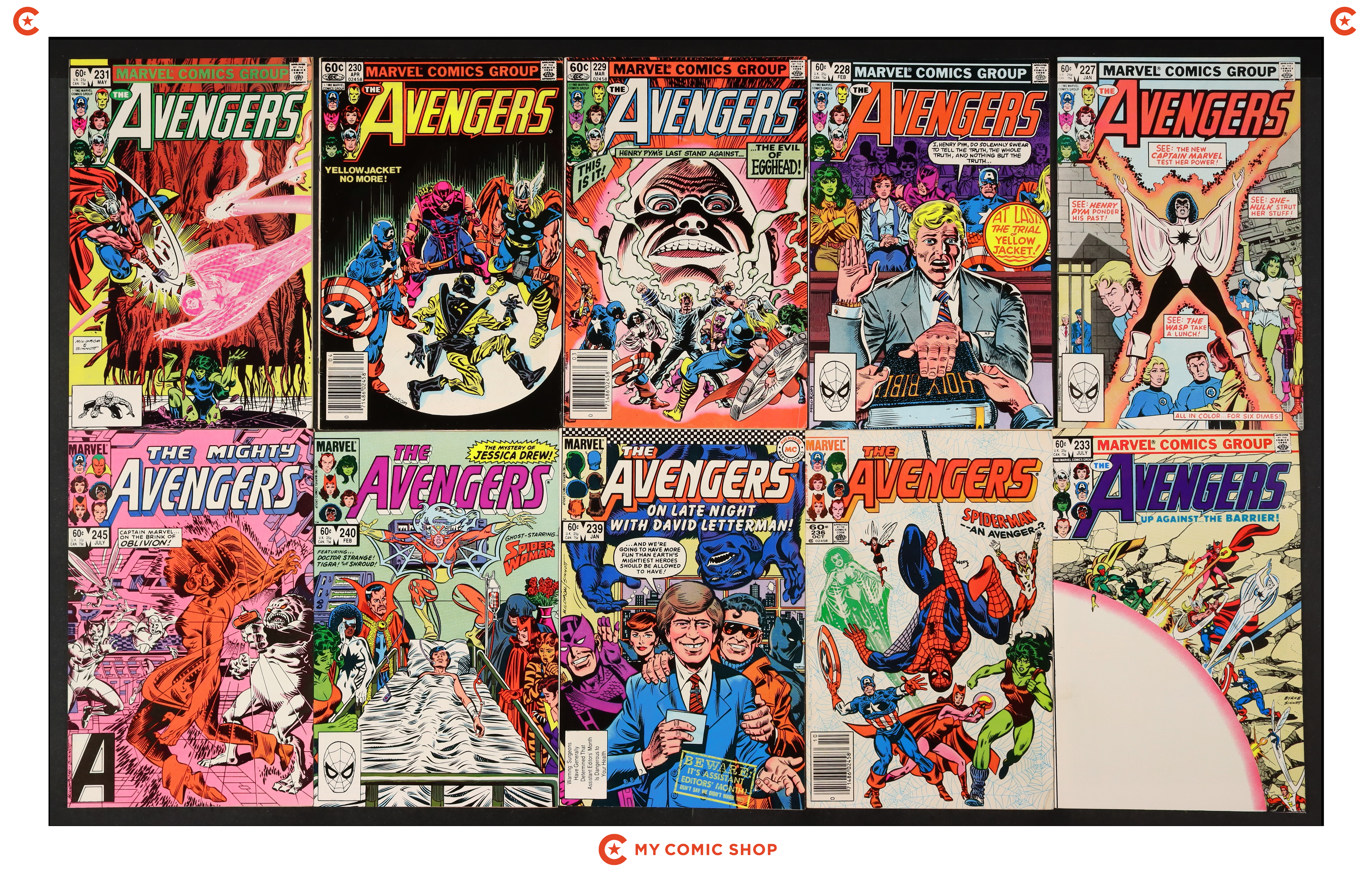 Issues 227D, 228, 229B.N, 230, 231, 233, 236N, 239, 240, 245, 246, 247N, 248, and 249 of Avengers (1963 1st Series). Most will grade in the VG to FN range.