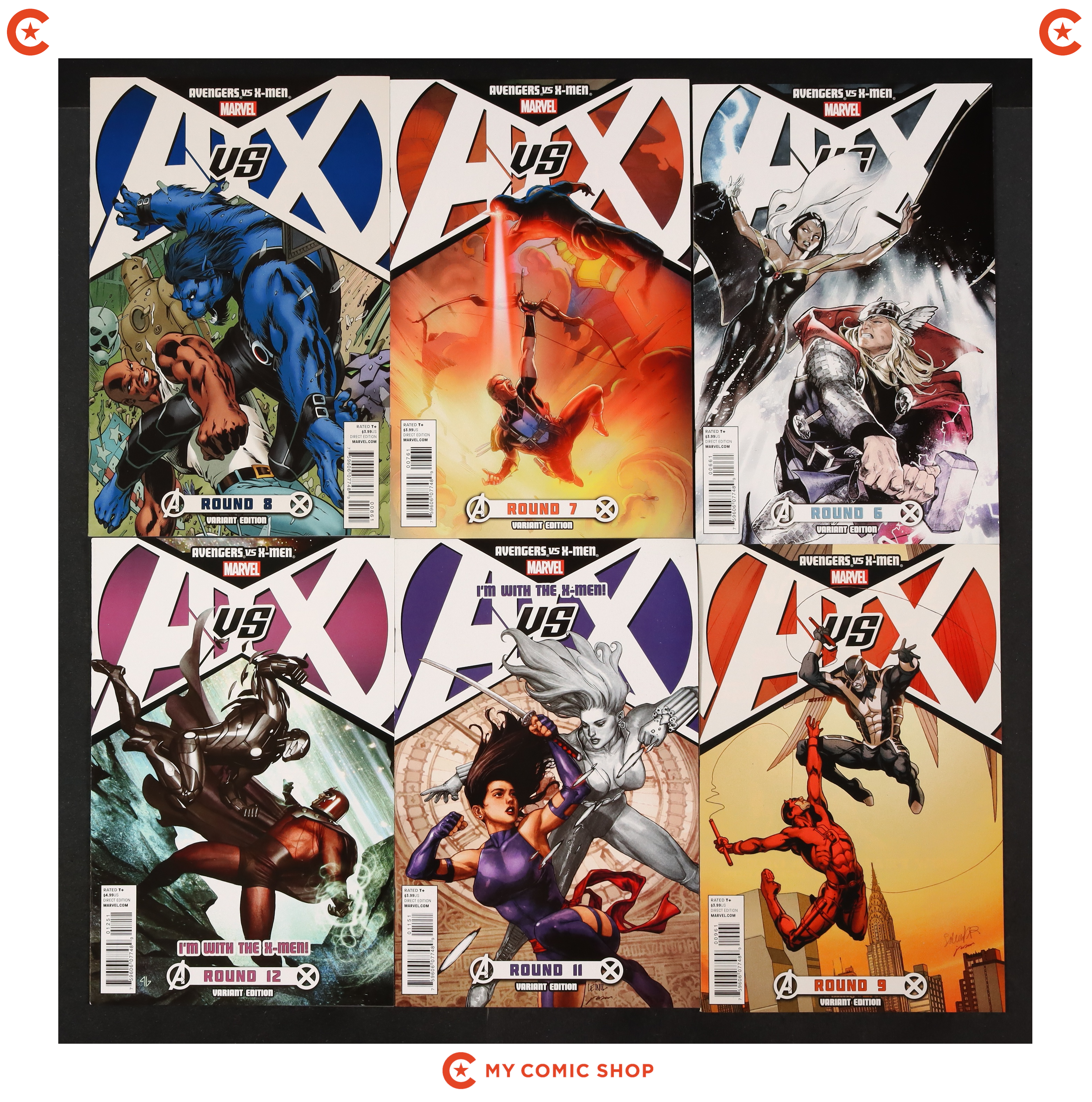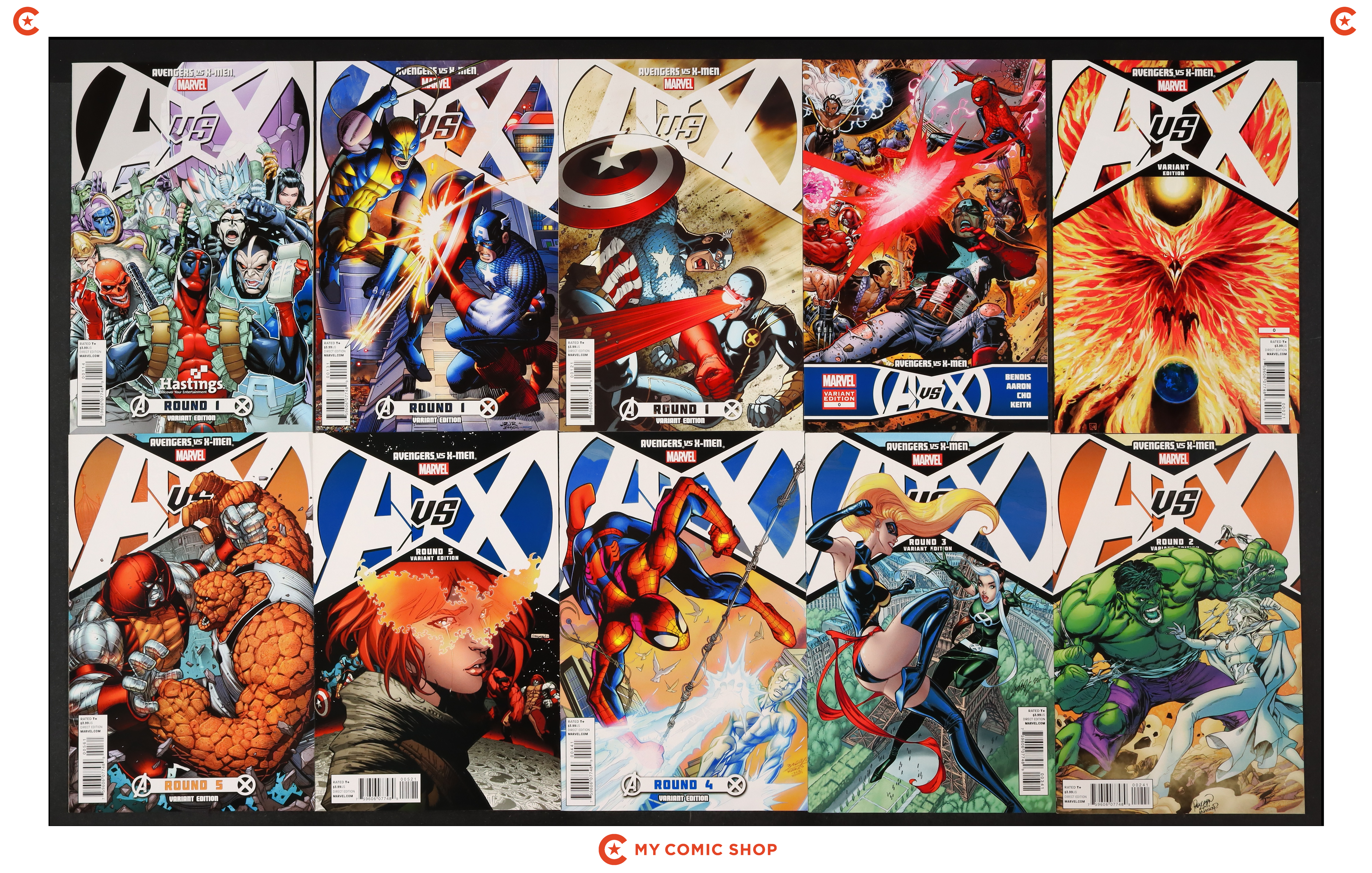 Issues 0B, 0C, 1B, 1C, 1HASTINGS, 2D, 3D, 4D, 5B, 5D, 6D, 7D, 8D, 9D, 11F, and 12E of Avengers vs. X-Men (2012 Marvel). Most will grade in the VF to NM range.