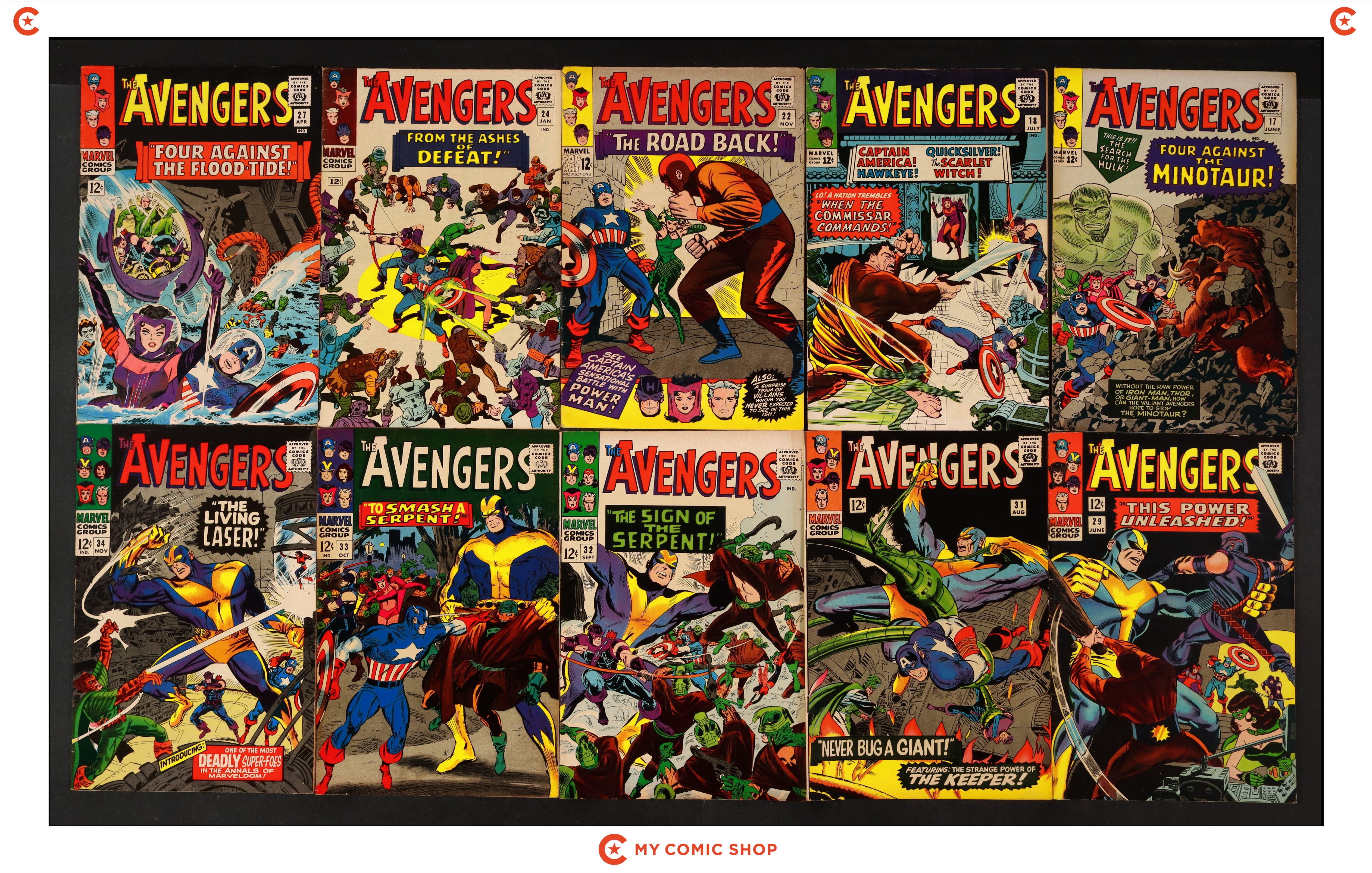 Issues 17, 18, 22, 24, 27, 29, and 31-34 of Avengers (1963 1st Series). Most will grade in the FN range with a couple grading VG.