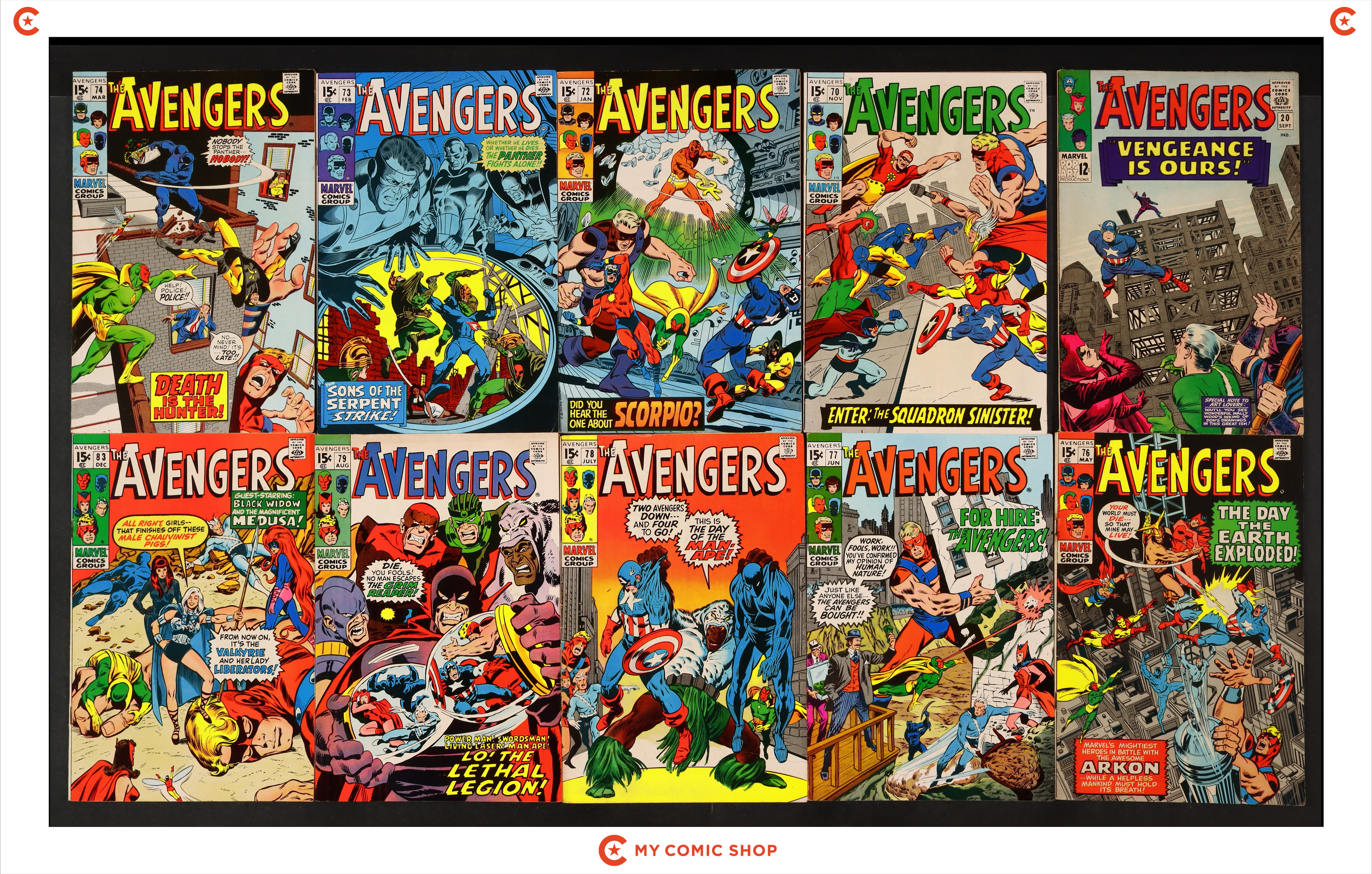 Issues 20, 70, 72-74, 76-79, and 83 of Avengers (1963 1st Series). Most will grade in the FN range with some grading VG.