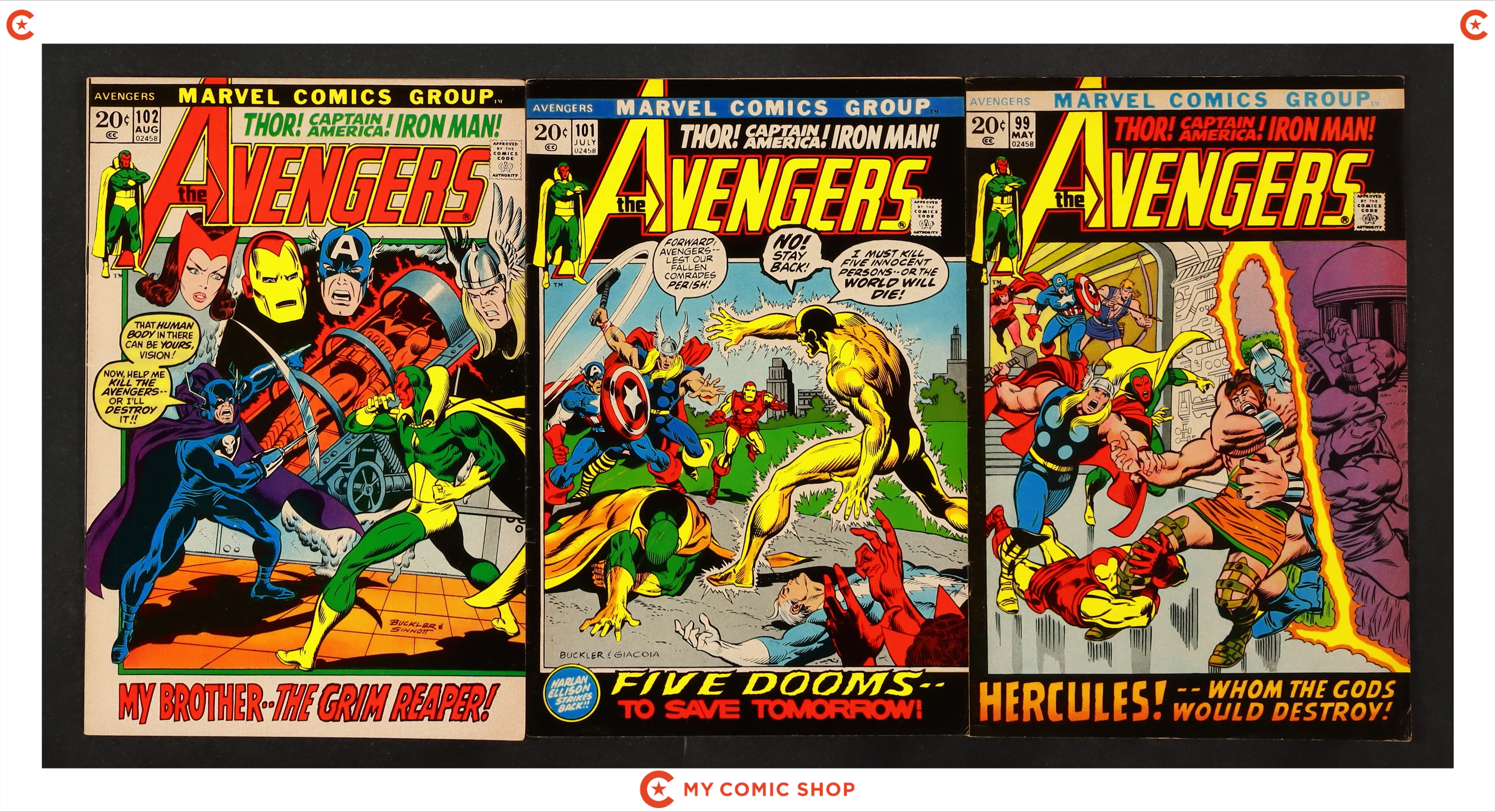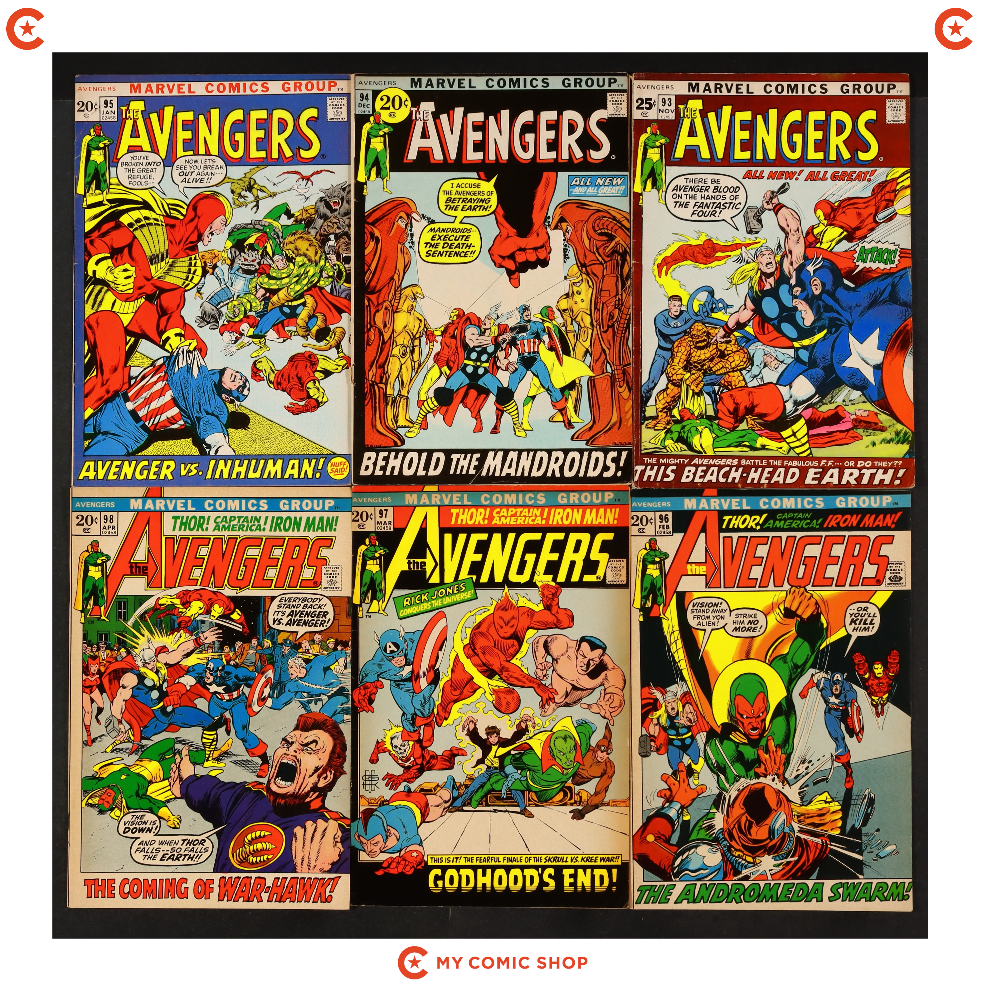 Issues 93, 94, 95, 96, 97, 98, 99, 101, 102 of Avengers (1963 1st Series). Most will grade in the VG+ to FN+ range, with #94 grading at GD.