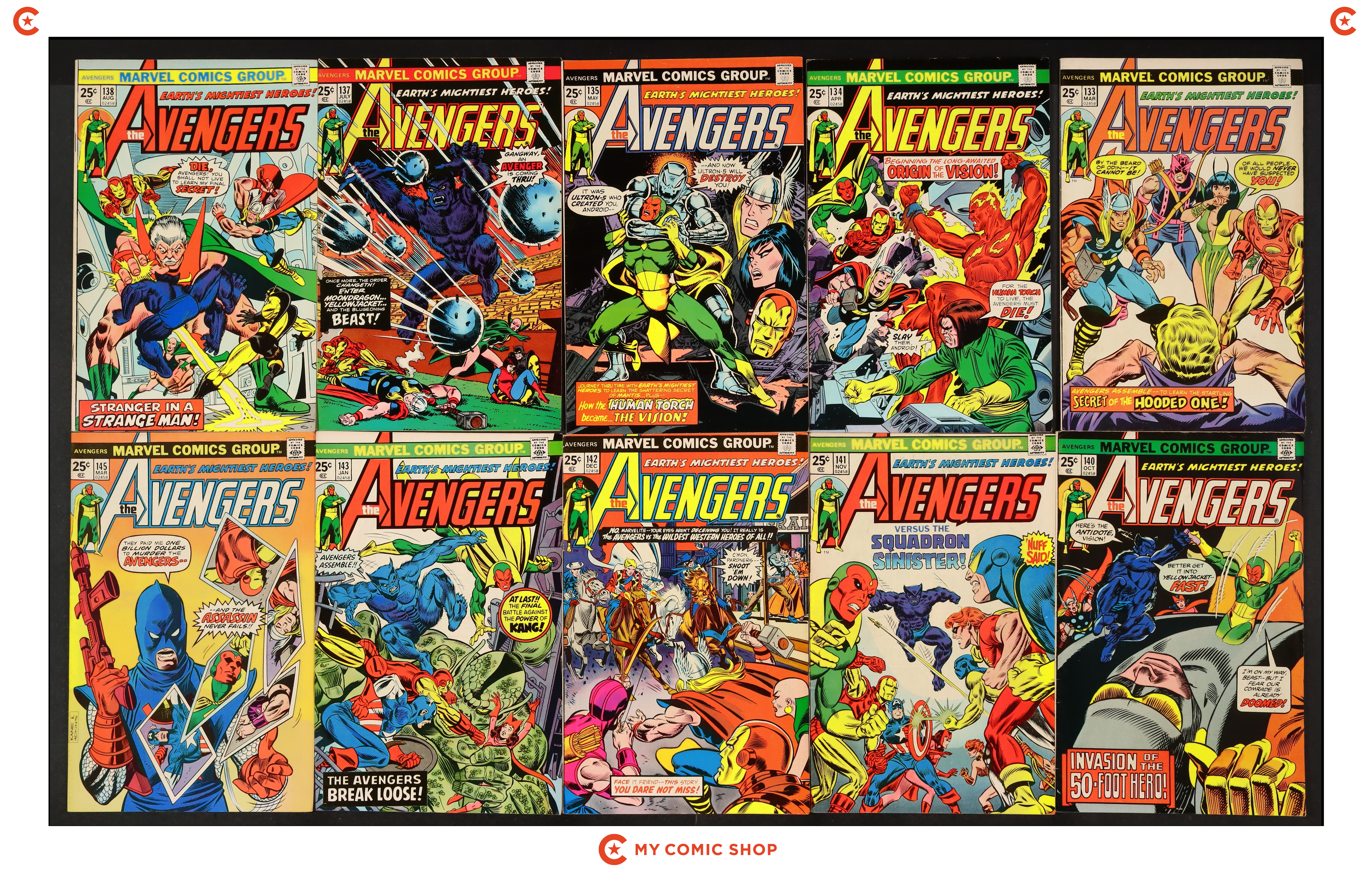 Issues 133, 134, 135, 137, 138, 140, 141, 142, 143, 145 of Avengers (1963 1st Series). Most will grade in the VG/FN to FN range.