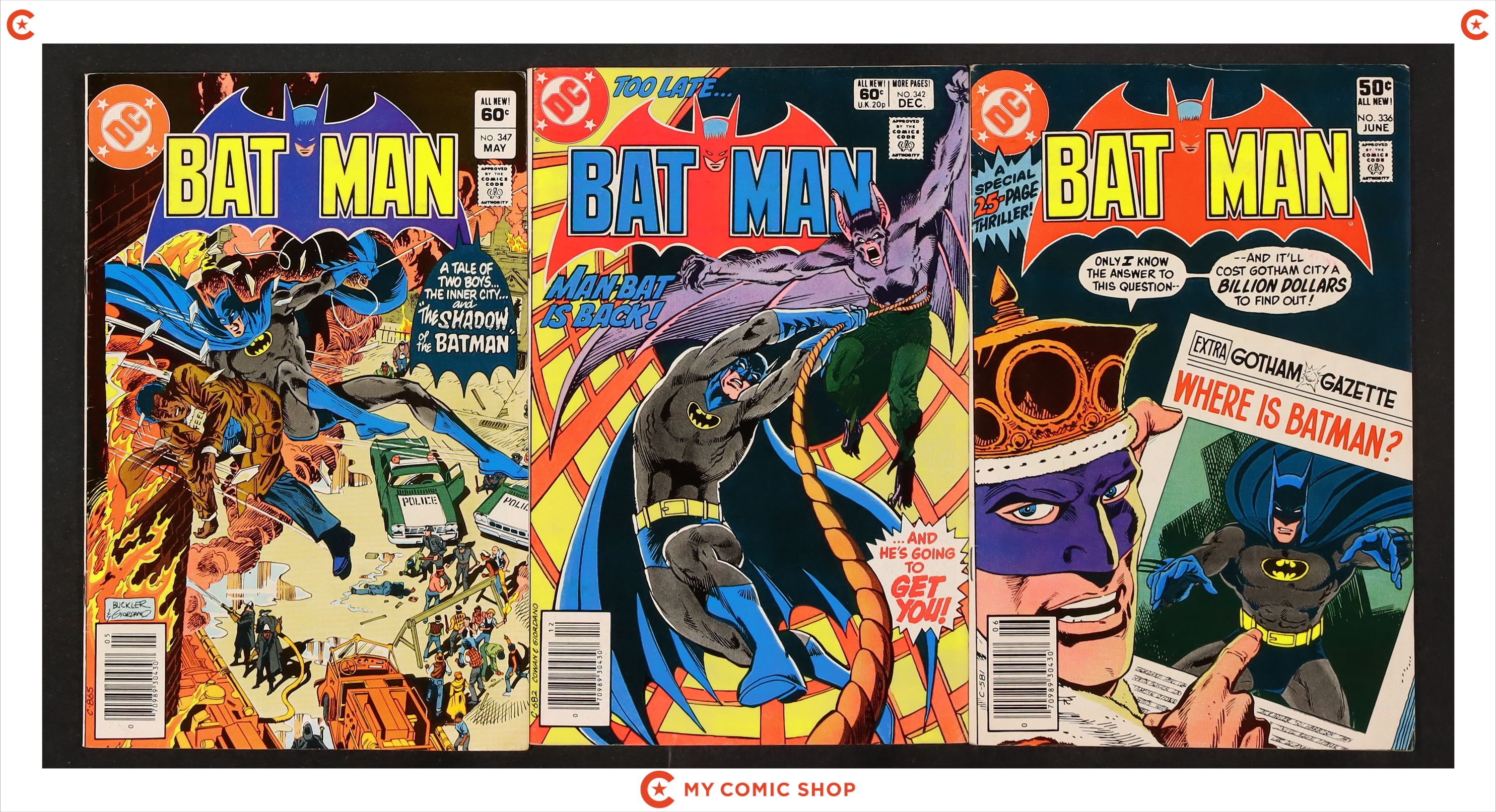 Issues 361N, 365, 374, 383, 393, and 403-407 of Batman (1940). Most will grade in the FN/VF to FN range with a couple grading VG and #374 grading GD.