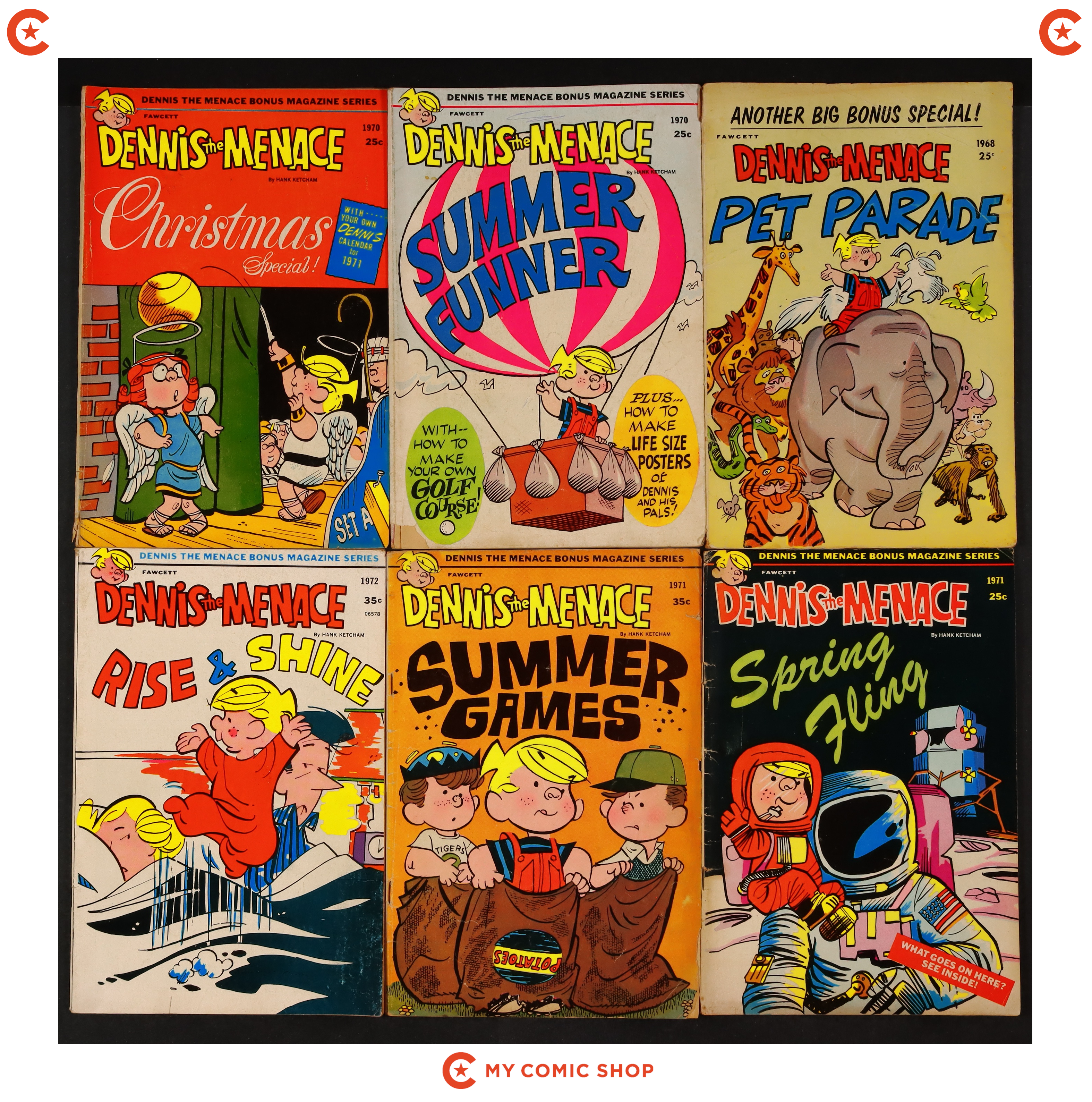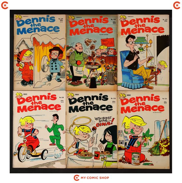 Issues 92, 98, 99, 104, 128, 135, and 146 of Dennis the Menace Bonus Magazine Series (1970); and 23 of Dennis the Menace and His Friends No.5-46 (1970). Most will grade in the VG range.