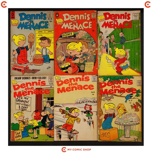 Issues 16, 23, 30, 79, 83, 88, 91, 99, and 105 of Dennis the Menace (1953 Standard/Pines/Haliden/Fawcett). Most will grade in the GD range with a couple grading FR.