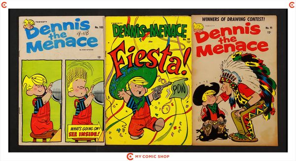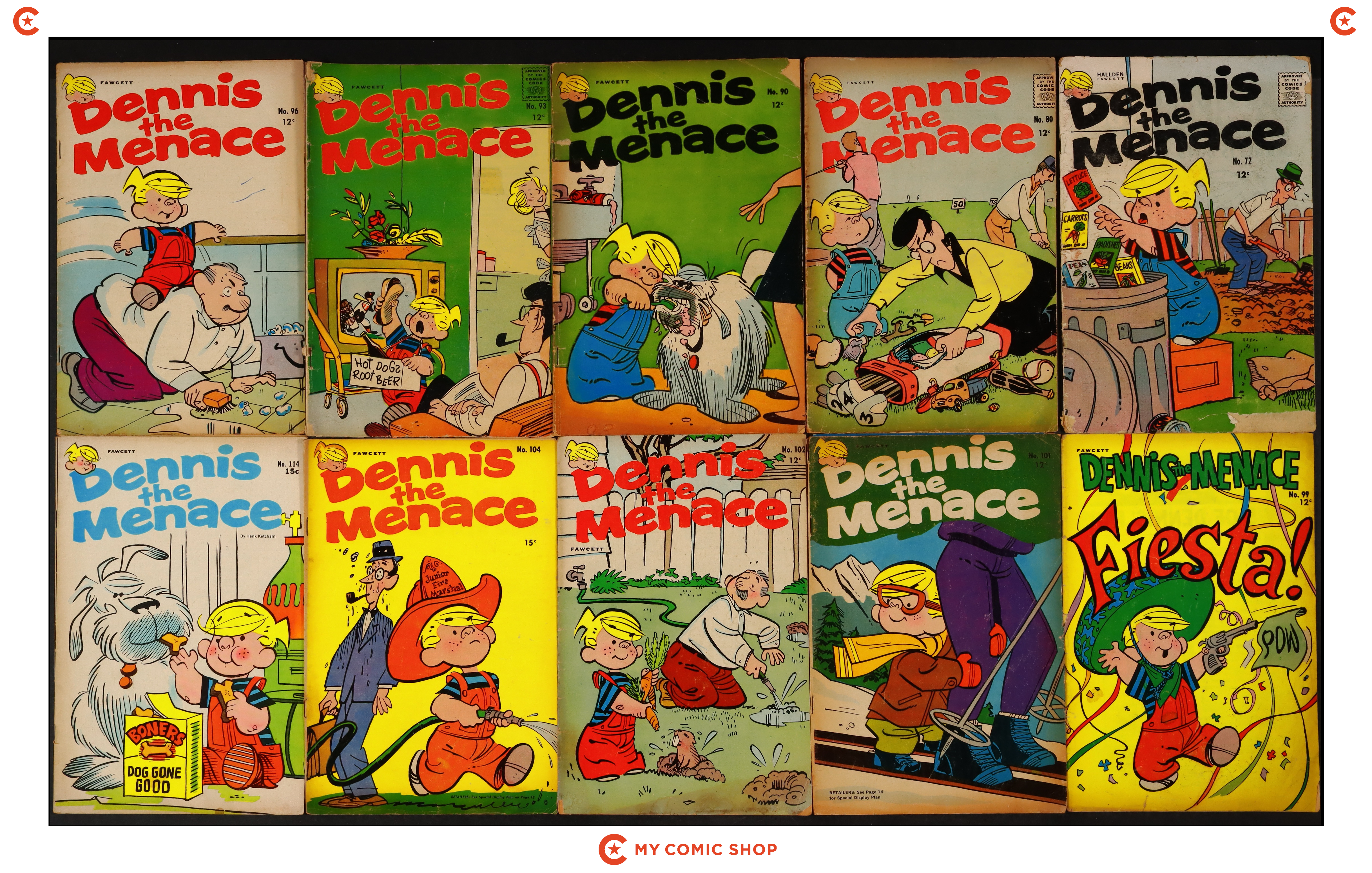 Issues 72, 80, 90, 93, 96, 99, 101, 102, 104, 114 of Dennis the Menace (1953 Standard/Pines/Haliden/Fawcett). Most will grade the GD range with #114 grading VG and #90 grading FR+.