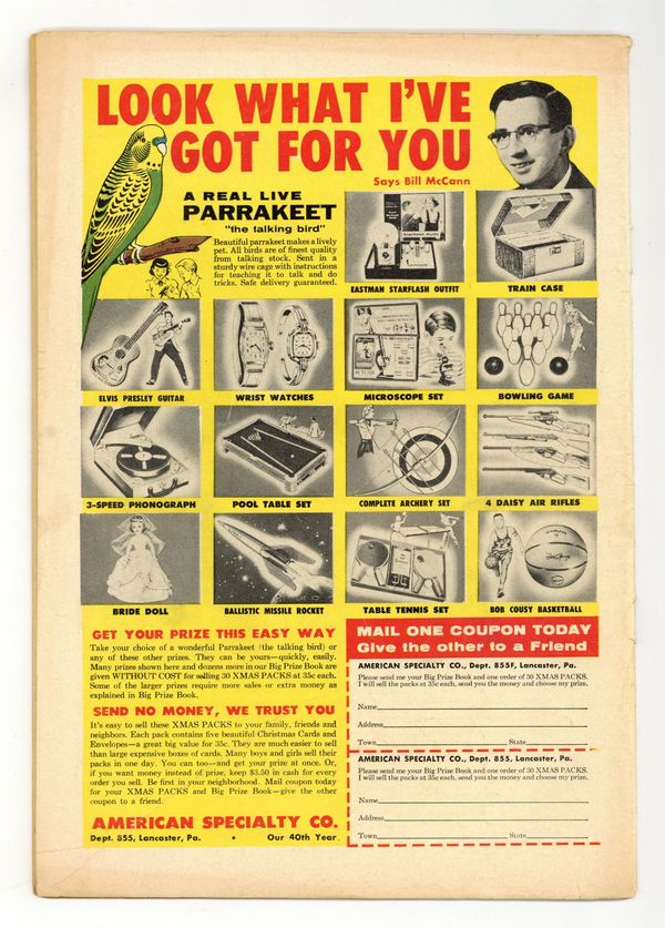 Starts Apr 4 Cover by Win Mortimer. Stories by Bill Woolfolk and unknown. Art by Dick Sprang, Charles Paris, Leonard Starr, Joe Certa and Ruben Moreira. When Bruce and Dick visit London's Scotland Yard, they are shocked to see a frame that once held a picture of Batman and Robin empty, and seek to find out why this has happened in "City Without Guns!" by Bill Woolfolk, Dick Sprang and Charles Paris. Plus: Pow-Wow Smith, Indian Lawman in "The Garments of the Golden Chief" with art by Leonard Starr; Robotman in "The Repeating Robotman!" with art by Joe Certa; and Impossible -- But True! tale "The Man from the 5th Dimension!" (featuring Roy Raymond) with art by Ruben Moreira. Also: Quick Quiz activity half-pager by H.T. Elmo; 2-page text story "Invitation to a Burglary" by Jack Miller; and Casey the Cop half-pager by Henry Boltinoff. 44 pages, full color. Cover price $0.10.