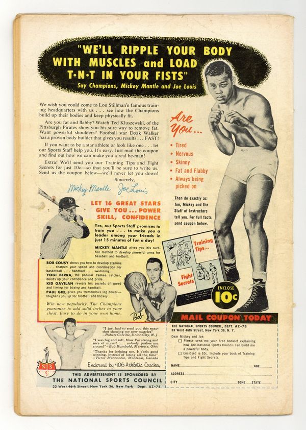 Ends Feb 23 7:57 PM CST Bid History 7 bids Current Bid $12 Your Secret Max Bid If you'd like to bid, please log in or register. Cover art by Sheldon Moldoff. "The Terrible Trio" starring Batman and Robin, pencils by Sheldon Moldoff, inks by Charles Paris; The Terrible Trio break jail and resume their criminal operations on land, sea, and air, forcing Batman and Robin to start a campaign to capture them; Meanwhile, Batwoman learns that some other criminal has escaped as well and she decides to investigate that case; She follows the crook to the lair of the Terrible Trio, but she is not aware that the fugitive is actually Batman, disguised as a crook; Once inside the hideout, Batman contacts Robin with his Utility Belt and they try to capture the Terrible Trio, but they are not prepared to deal with the traps the criminals have rigged in the place; The Trio capture Batman and Robin and place them in rocket ships. Your United Nations at Work public service announcement, script by Jack Schiff, art by Sheldon Moldoff. Cameras That Catch Crooks article. "The Cosmic Creature" starring John Jones Manhunter from Mars, art by Joe Certa; Manhunter battles a shape-changing beast from outer space. 36 pgs., full color. Cover price $0.12.