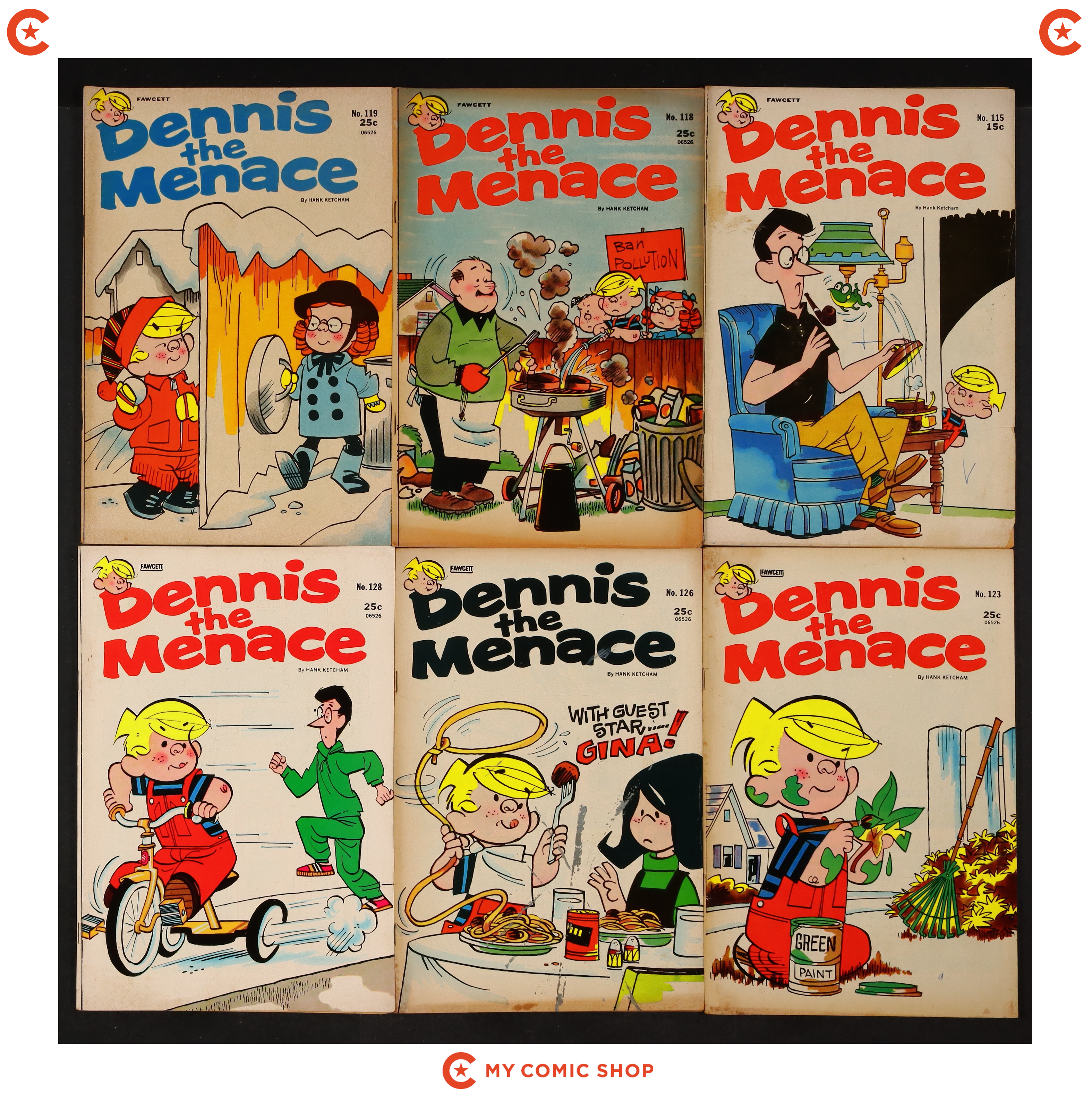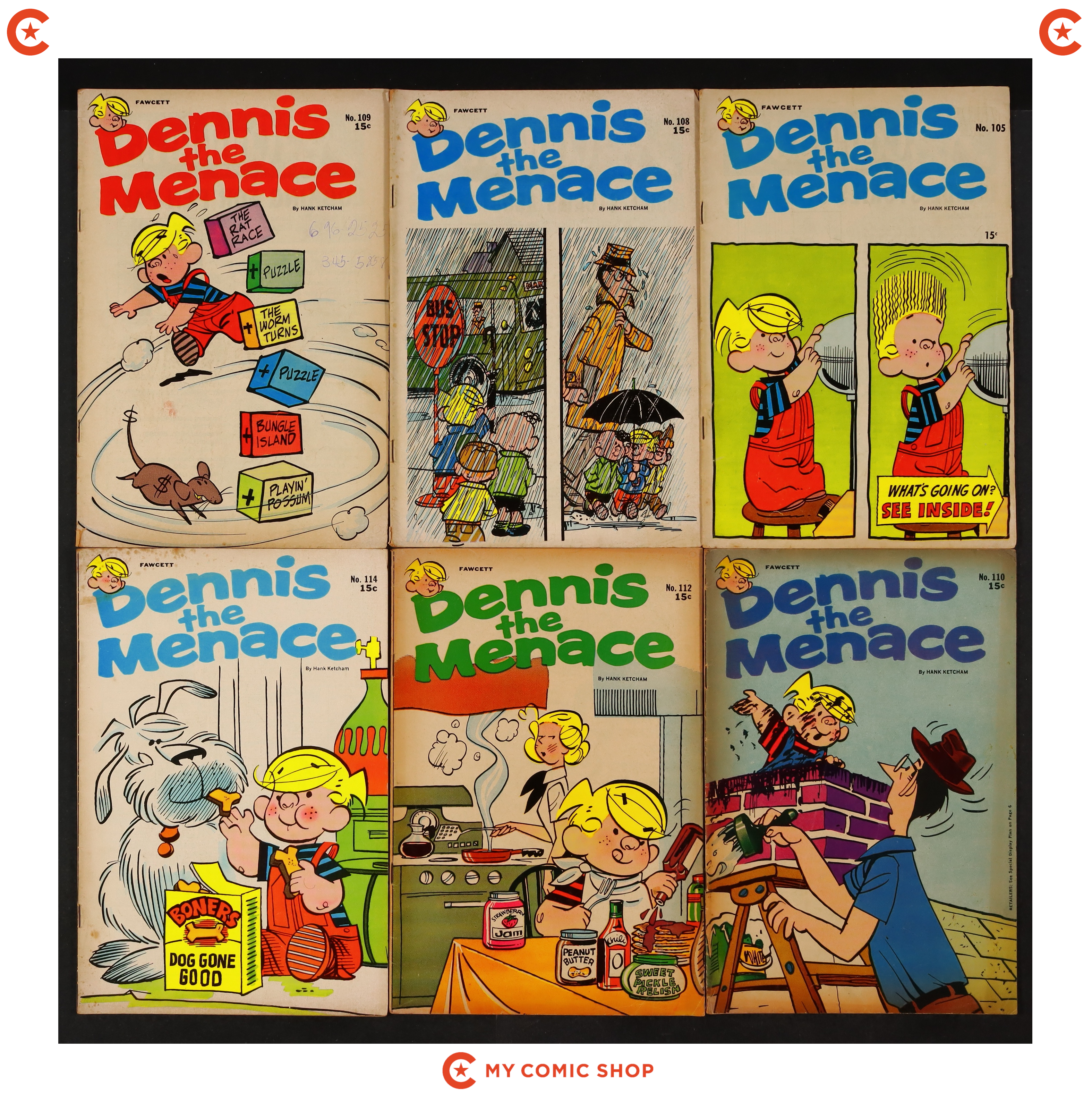 Issues 105, 108, 109, 110, 112, 114, 115, 118, 119, 123, 126, and 128 of Dennis the Menace (1953 Standard/Pines/Haliden/Fawcett). Most will grade in the GD to VG range.