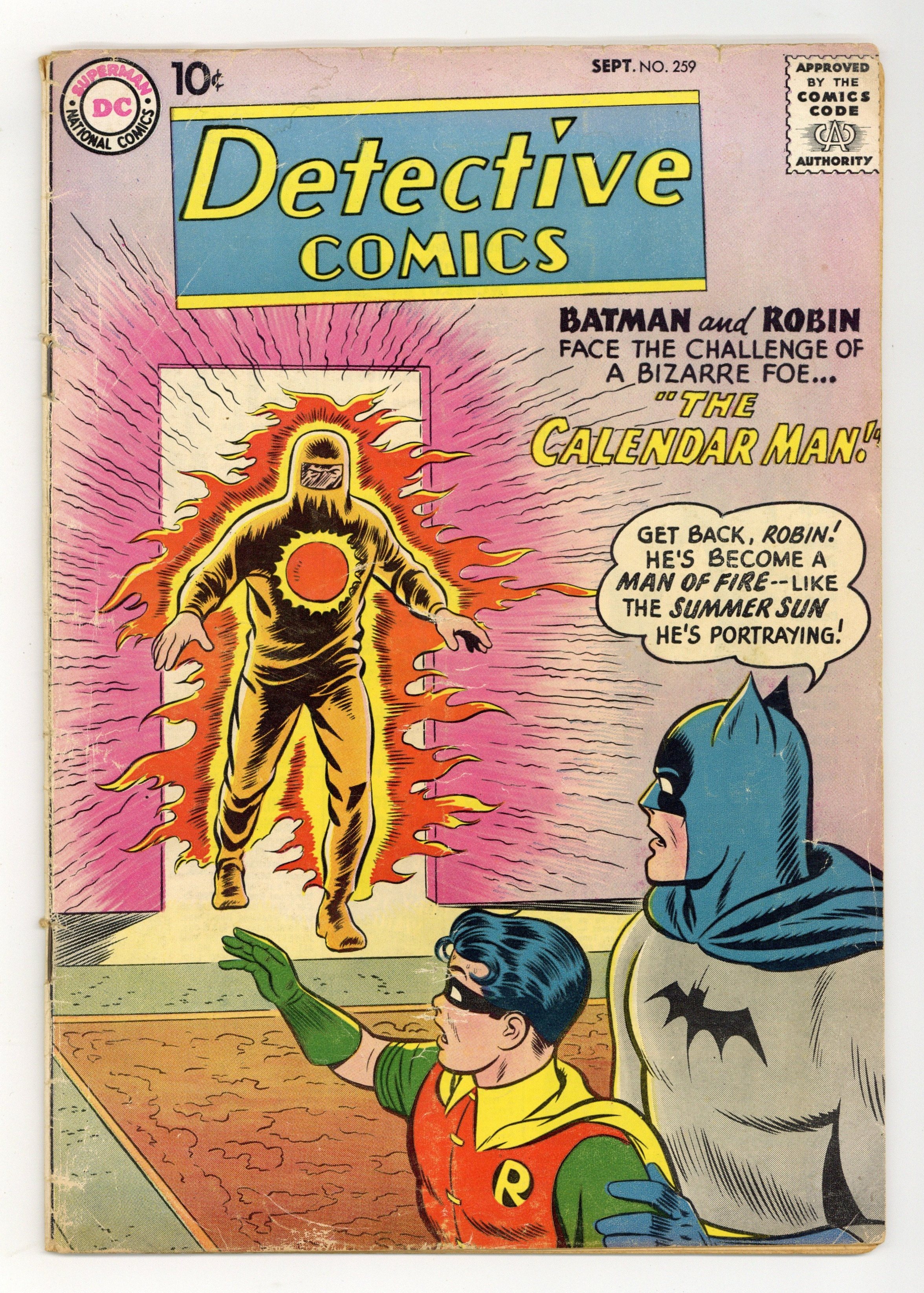 Starts Mar 2 Cover pencils by Curt Swan, inks by Stan Kaye. "The Challenge of the Calendar Man" starring Batman, Robin, and Calendar Man (1st appearance), script by Bill Finger, pencils by Sheldon Moldoff (as Bob Kane), inks by Charles Paris; A new criminal, trying to make a name for himself, challenges Batman to a duel of wits with all of his crimes being based on the "five" seasons. Know Your Pet! public service announcement, script by Jack Schiff, art by Don Cameron. Jail Jests humor page by Henry Boltinoff. "The Tiny Catastrophes" starring Roy Raymond TV Detective, art by Ruben Moreira; Roy battles Harry Harper. "Manhunt on the Mesa" text story. Casey the Cop half-page by Henry Boltinoff. "The Getaway King" starring John Jones Manhunter from Mars, art by Joe Certa; Martian Manhunter battles The Getaway Mastermind (Monty Moran), an expert at spectacular getaways. 36 pgs., full color. Cover price $0.10.