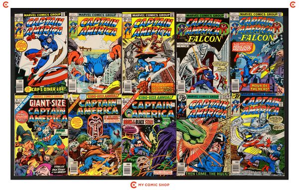 Issues 301, 336, 347, 362, 374, 378MJ, 387, 388, and 399 of Captain America (1968 1st Series); and 9 of Captain America (1968 1st Series) Annual. Most will grade in the 9 of Captain America (1968 1st Series) Annual. Most will grade in the VG range with a few grading FN.