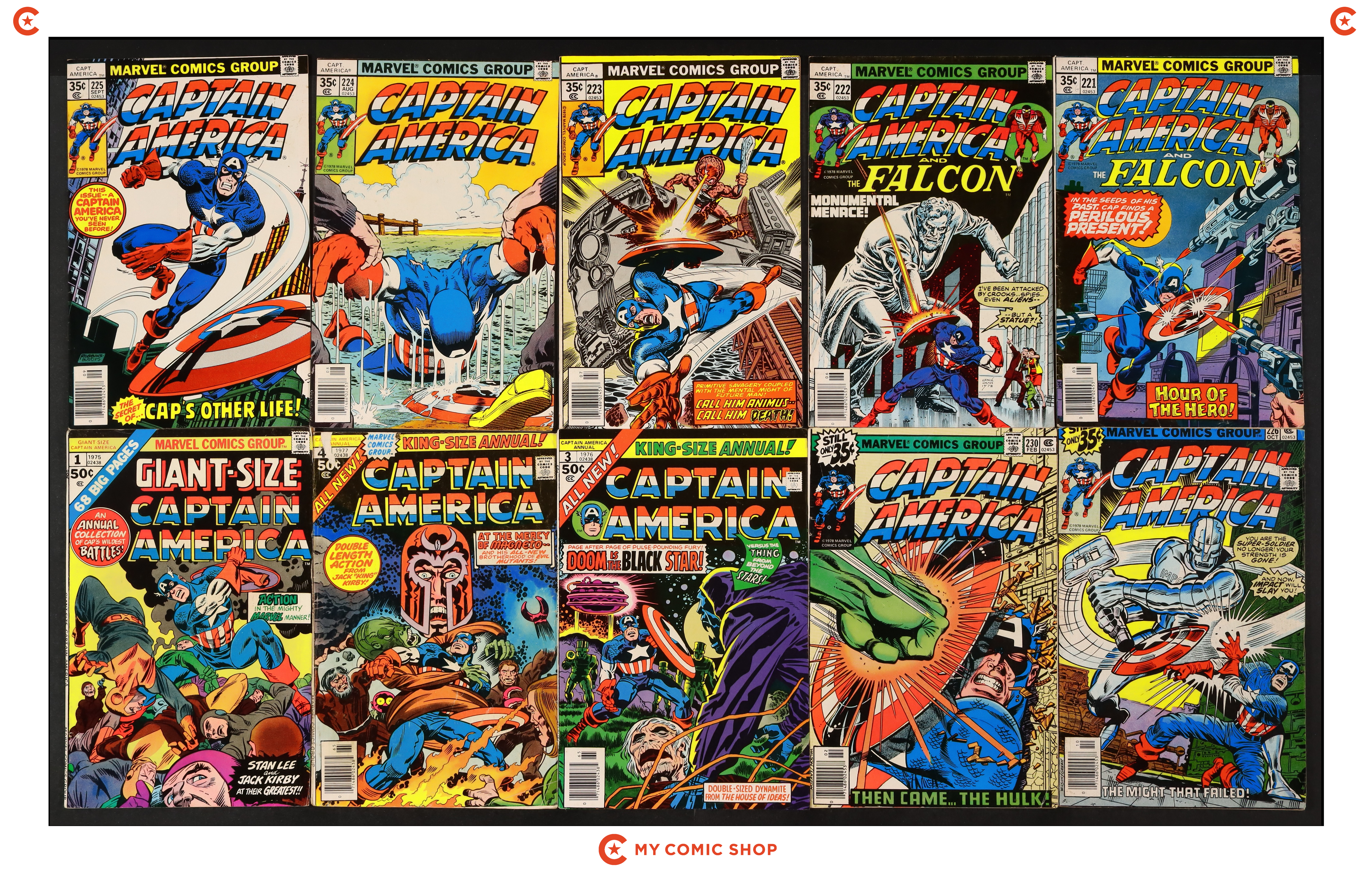 Issues 221-226 and 230 of Captain America (1968 1st Series); 3 and 4 of Captain America (1968 1st Series) Annual; and 1 of Giant Size Captain America (1975). Most will grade in the FN to VG range.