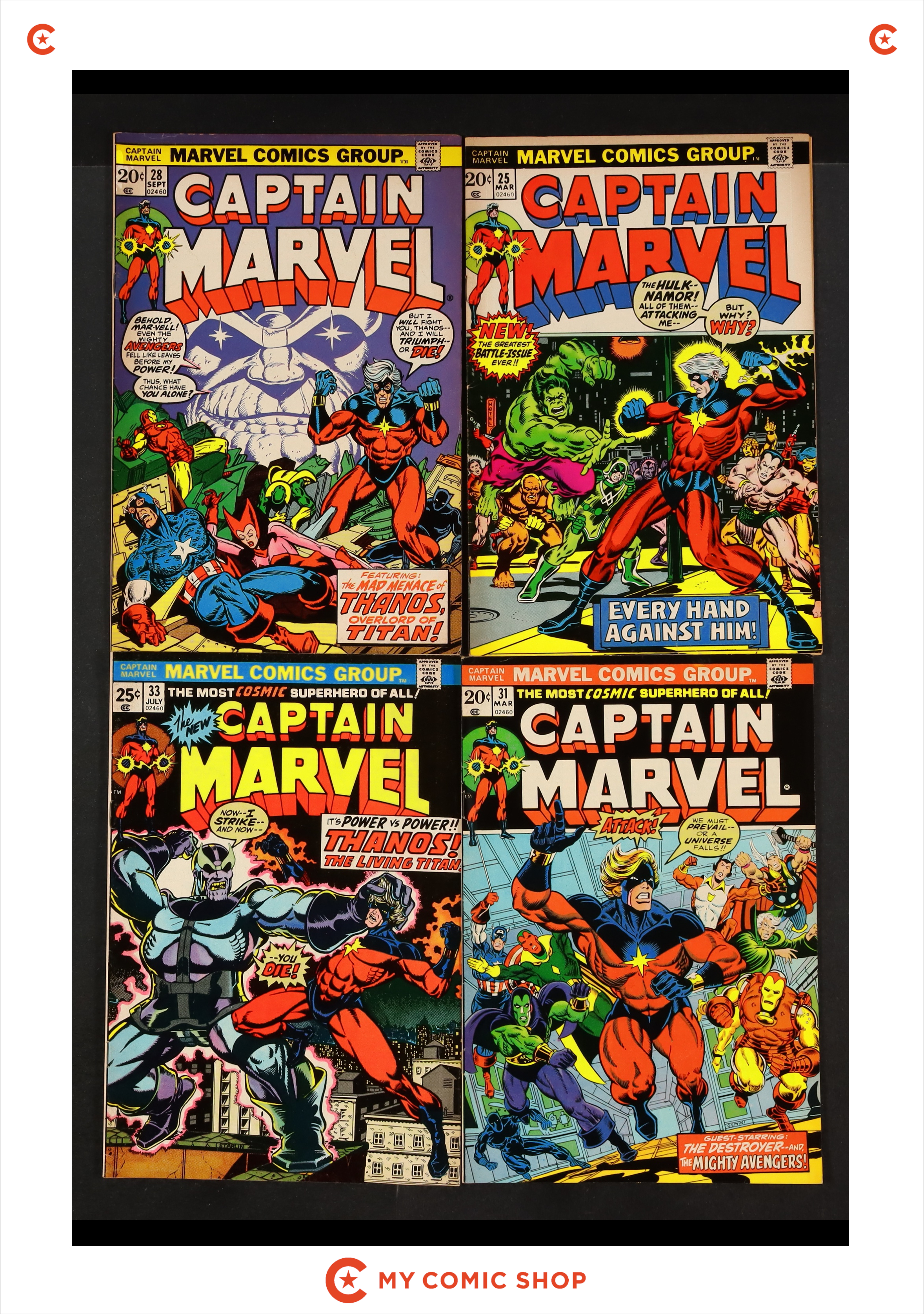 Issues 25, 28, 31, 33 of Captain Marvel (1968 1st Series Marvel). Most will grade in the VG to FN range.