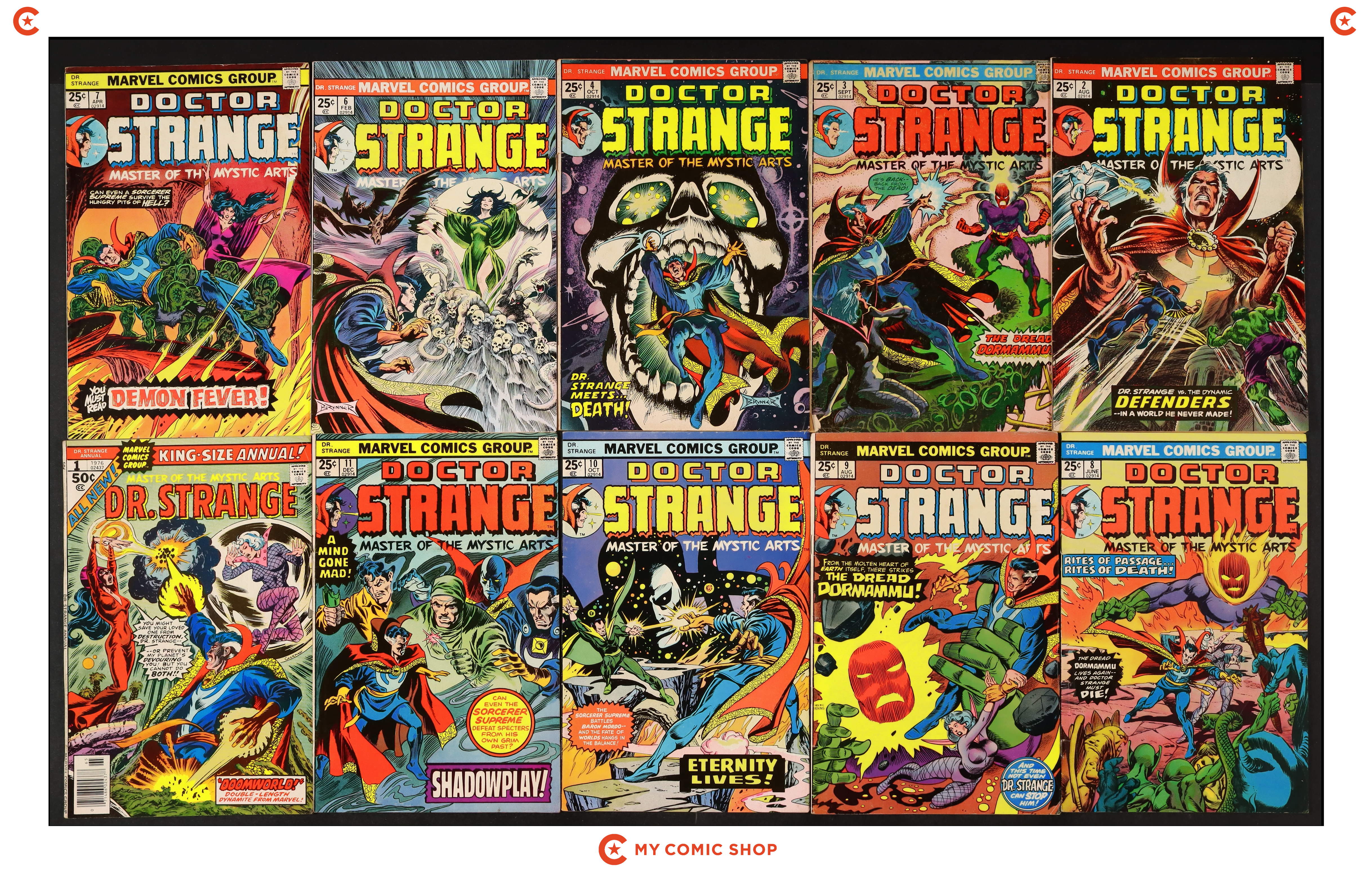 Issues 2, 3, 4, 6, 7, 8, 9, 10, 11 and Annual 1 of Doctor Strange (1974 2nd Series). Most will grade in the VG- to FN- range, with #3 grading at FR.