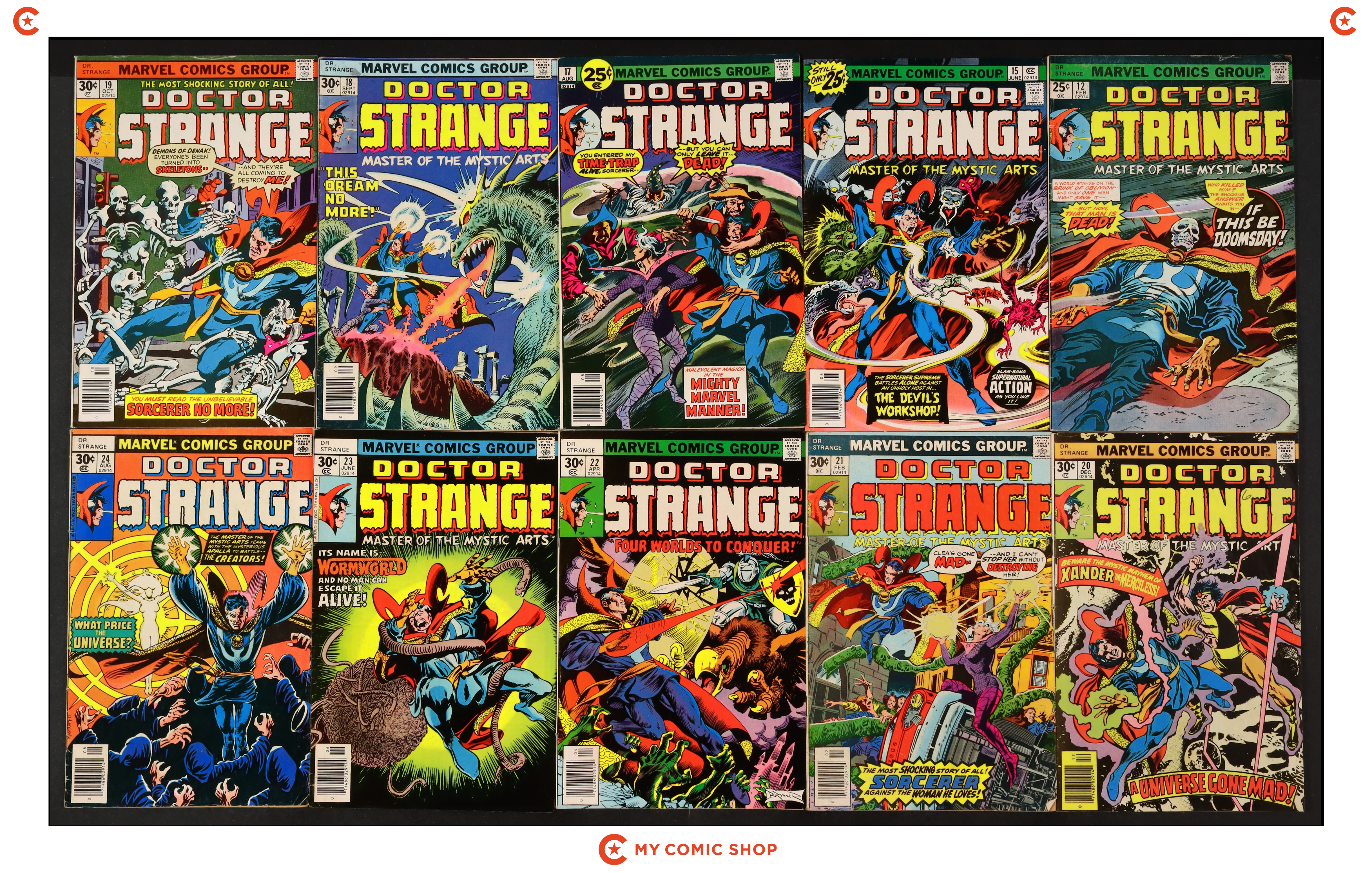 Issues 12, 15, 17-24 of Doctor Strange (1974 2nd Series). Most will grade in the GD/VG to VG/FN range.