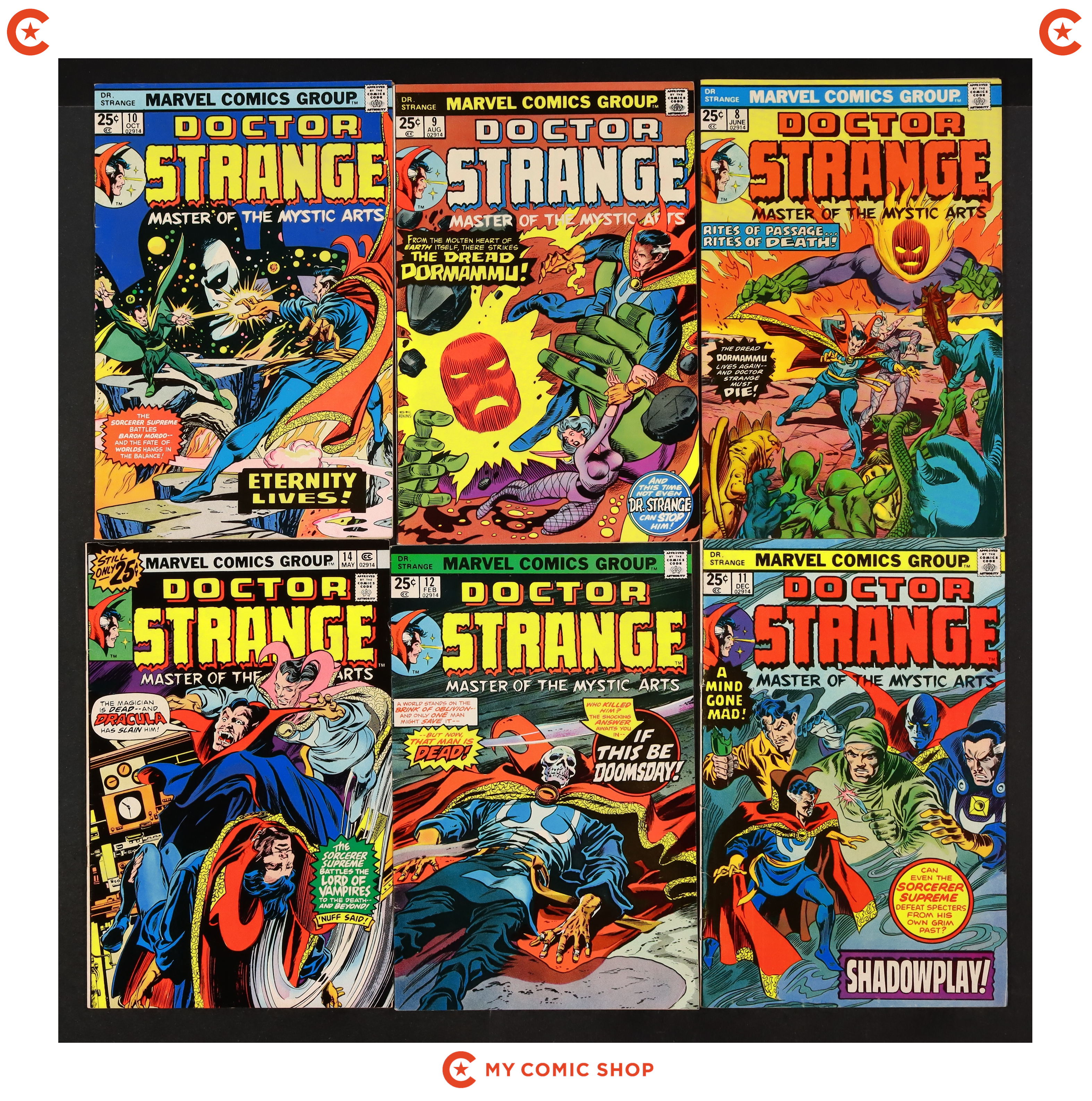 Issues 8-12, 14 of Doctor Strange (1974 2nd Series). Most will grade in the VG to FN range.