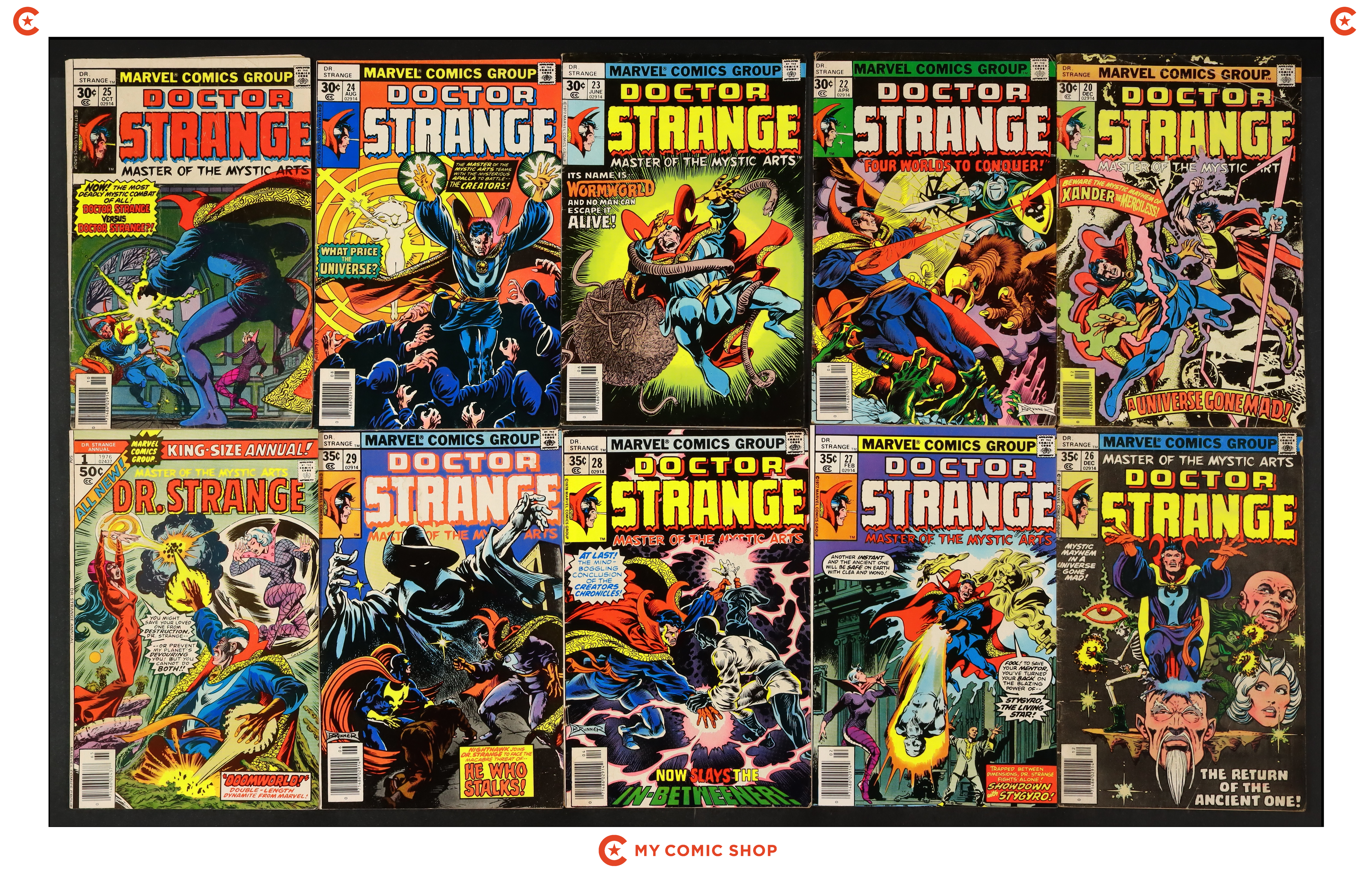 Issues 20, 22, 23, 24, 25, 26, 27, 28 and Annual 1 of Doctor Strange (1974 2nd Series); plus Mark Jewelers Variant #29MJ. Most will grade in the FR/GD to VG/FN range.