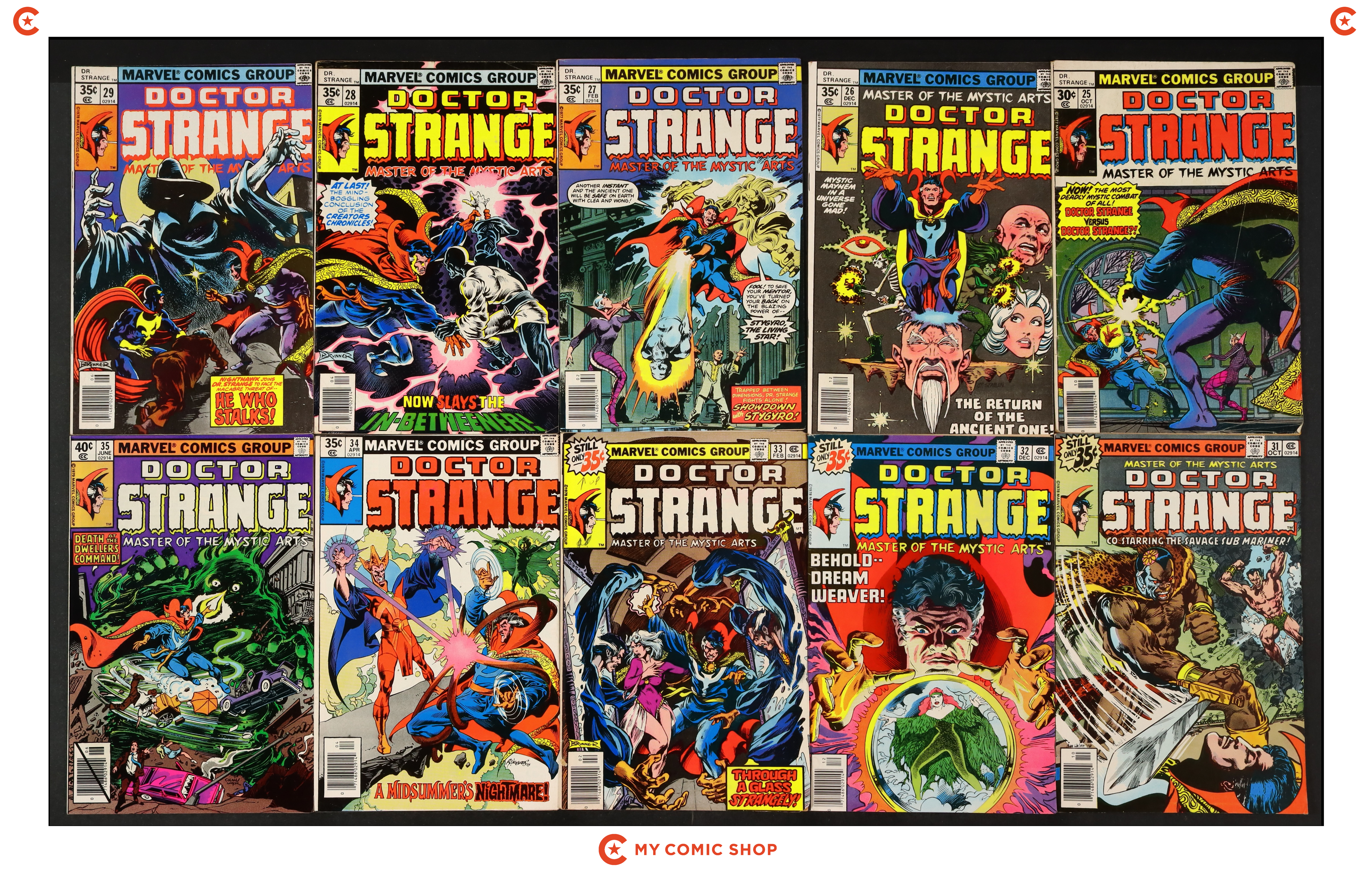 Issues 25, 26, 27, 28, 29, 31, 32, 33, 34, 35D of Doctor Strange (1974 2nd Series). Most will grade in the VG/FN to FN/VF range, with #25 grading at GD.