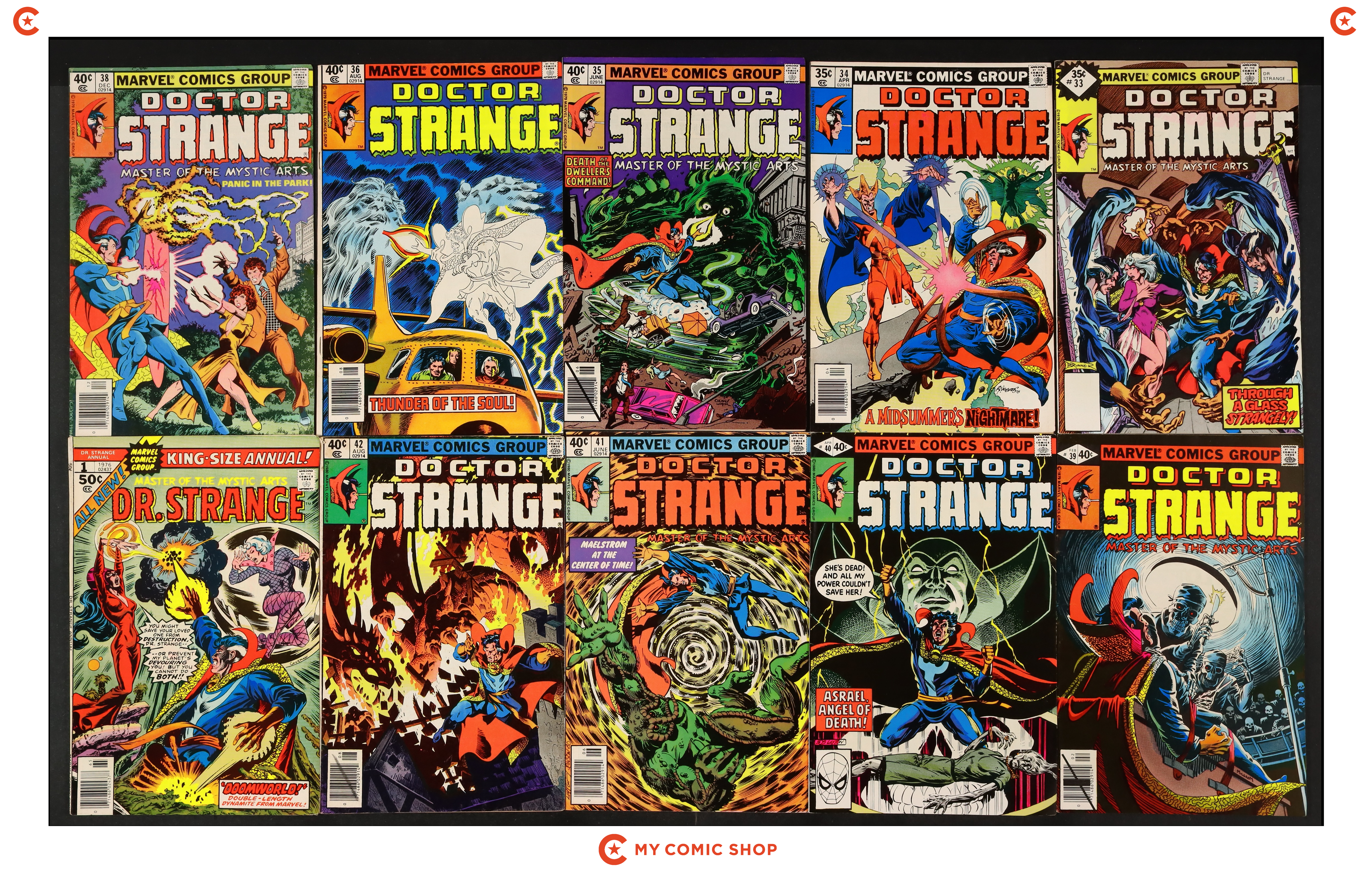 Issues 34, 35D, 36N, 38N, 39, 40, 41, 42 and Annual 1 of Doctor Strange (1974 2nd Series); plus Whitman Variant #33. Most will grade in the VG to FN/VF range.