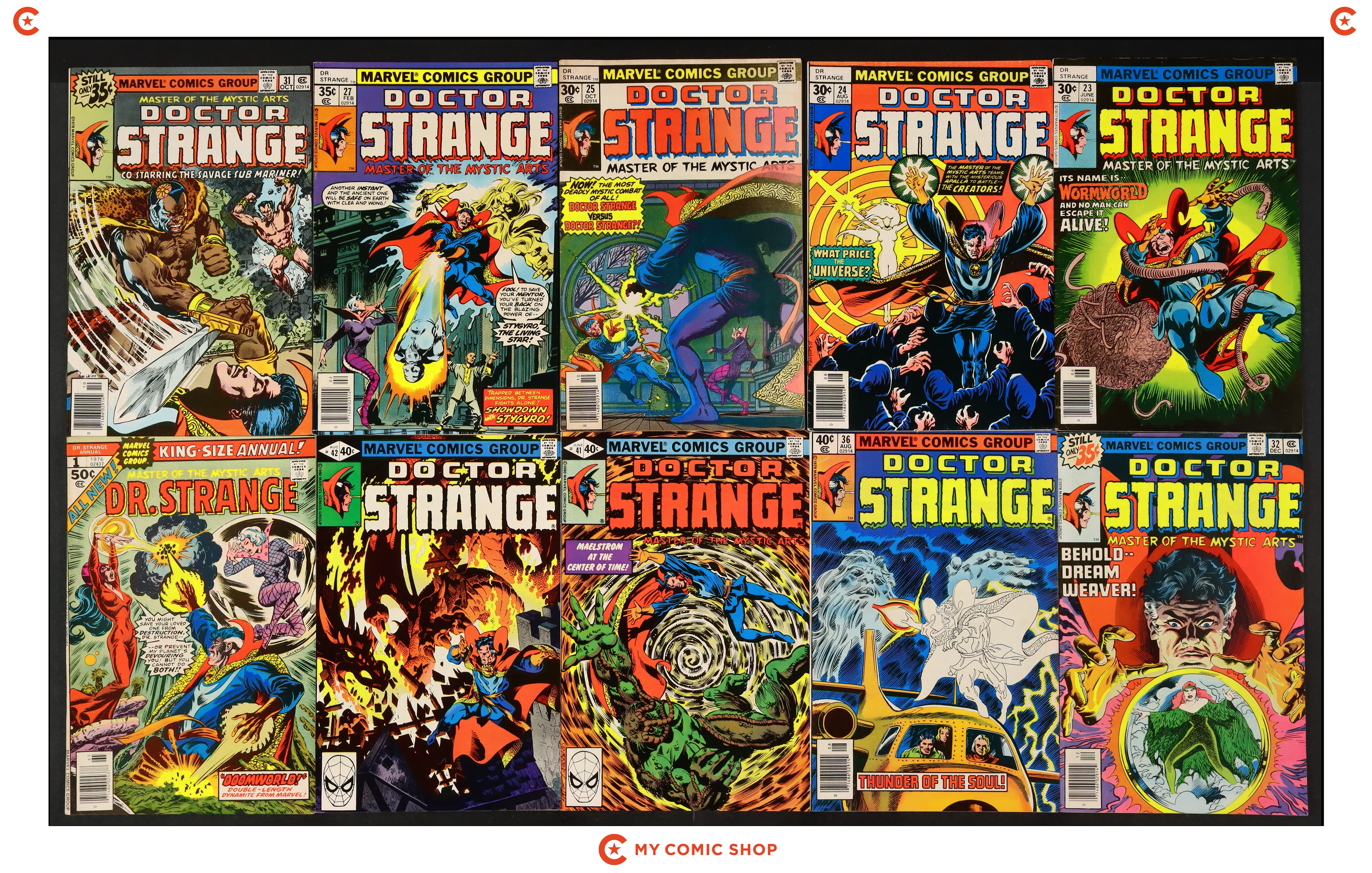 Issues 23, 24, 25, 27, 31, 32, 36N, 41, 42 and Annual 1 of Doctor Strange (1974 2nd Series). Most will grade in the VG to FN/VF range.
