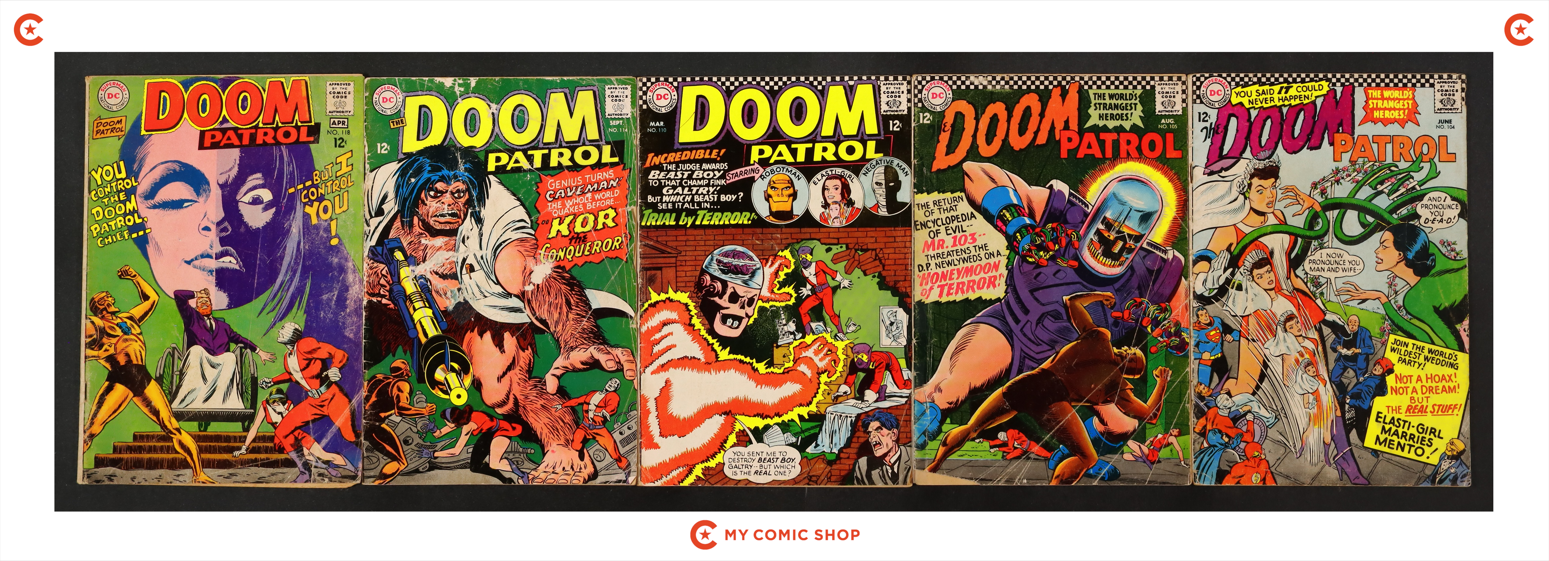 Issues 104, 105, 110, 114, 118 of Doom Patrol (1964 1st Series). Most will grade in the FR to GD+ range, with #114 grading at PR (mold).