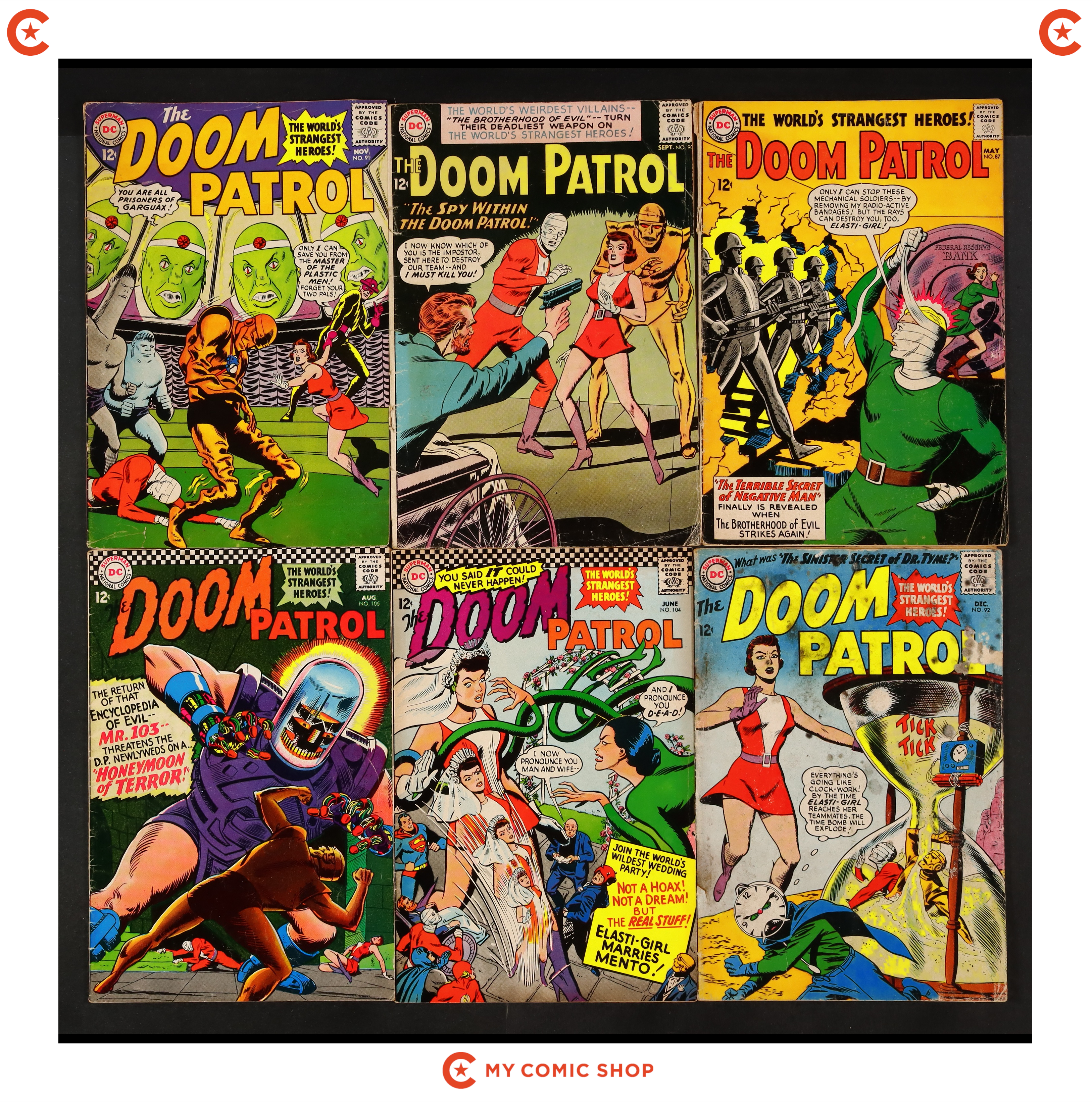 Issues 87, 90, 91, 92, 104, 105 of Doom Patrol (1964 1st Series). Most will grade in the GD- to VG+ range, with #92 grading at PR (mold).