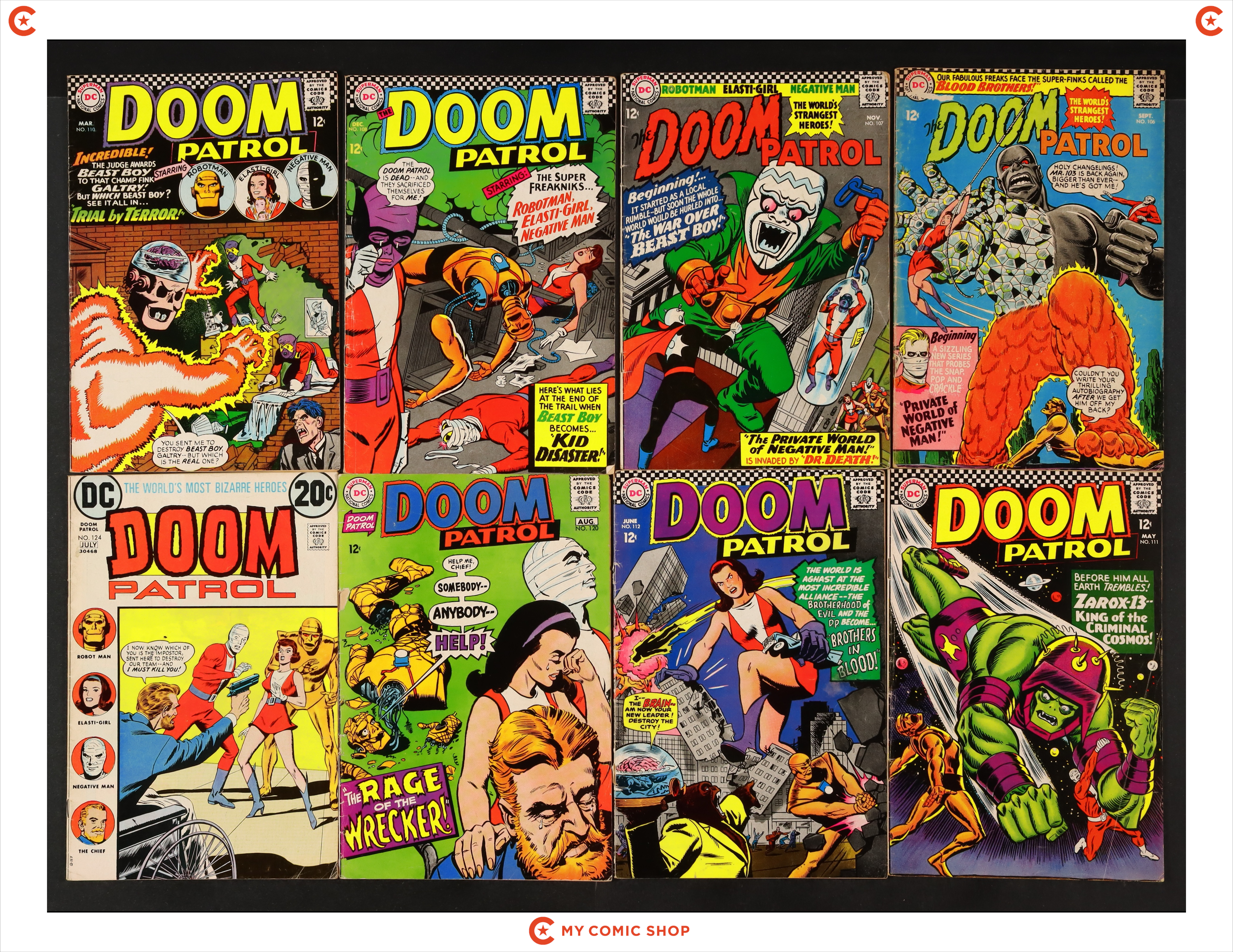 Issues 106, 107, 108, 110, 111, 112, 120, 124 of Doom Patrol (1964 1st Series). Most will grade in the GD to VG range.