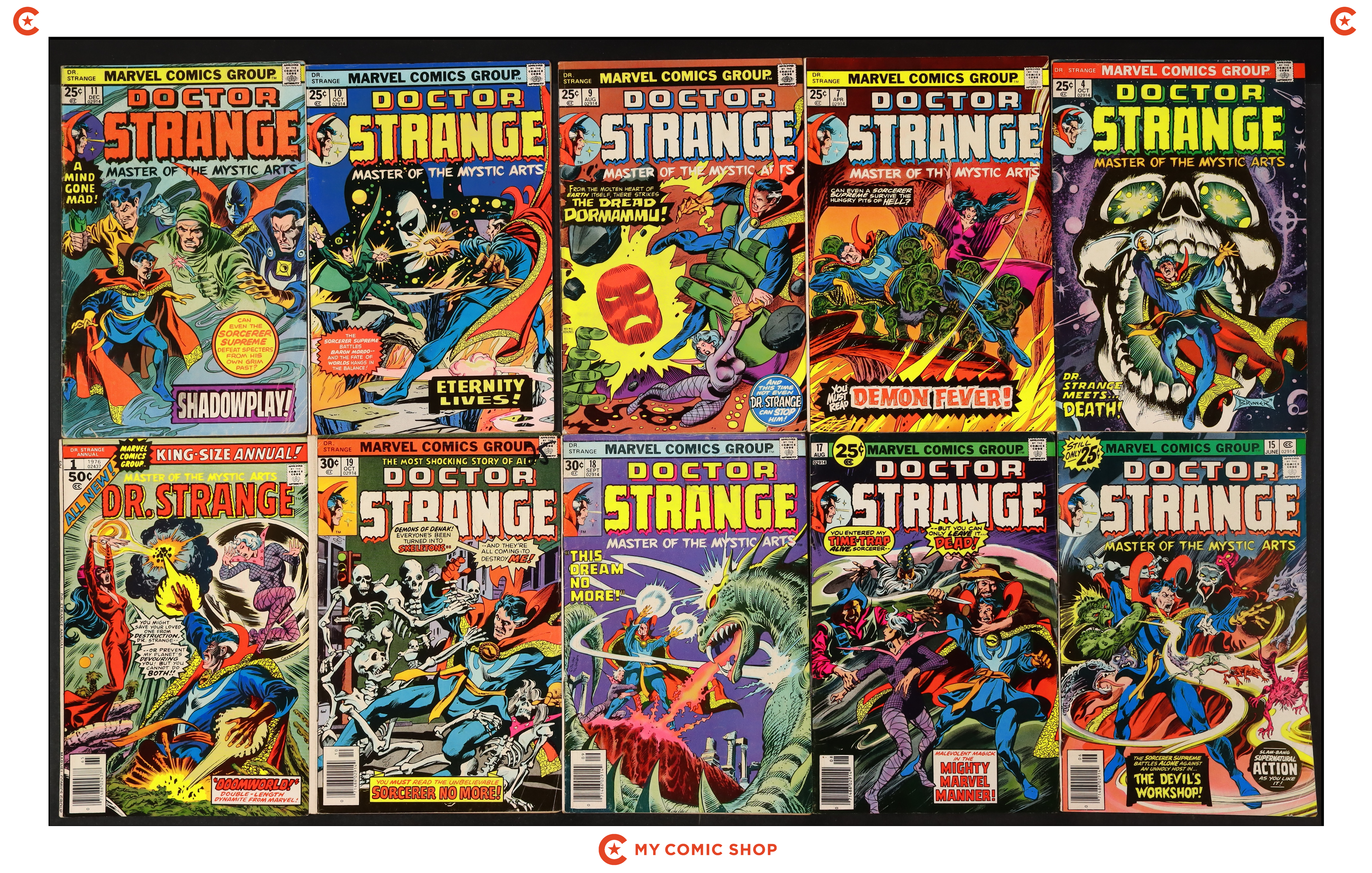 Issues 4, 7, 9, 10, 11, 15, 17, 18, 19 and Annual 1 of Doctor Strange (1974 2nd Series). Most will grade in the GD/VG to VG/FN range.