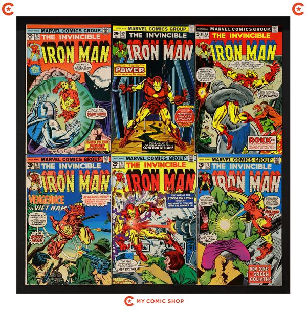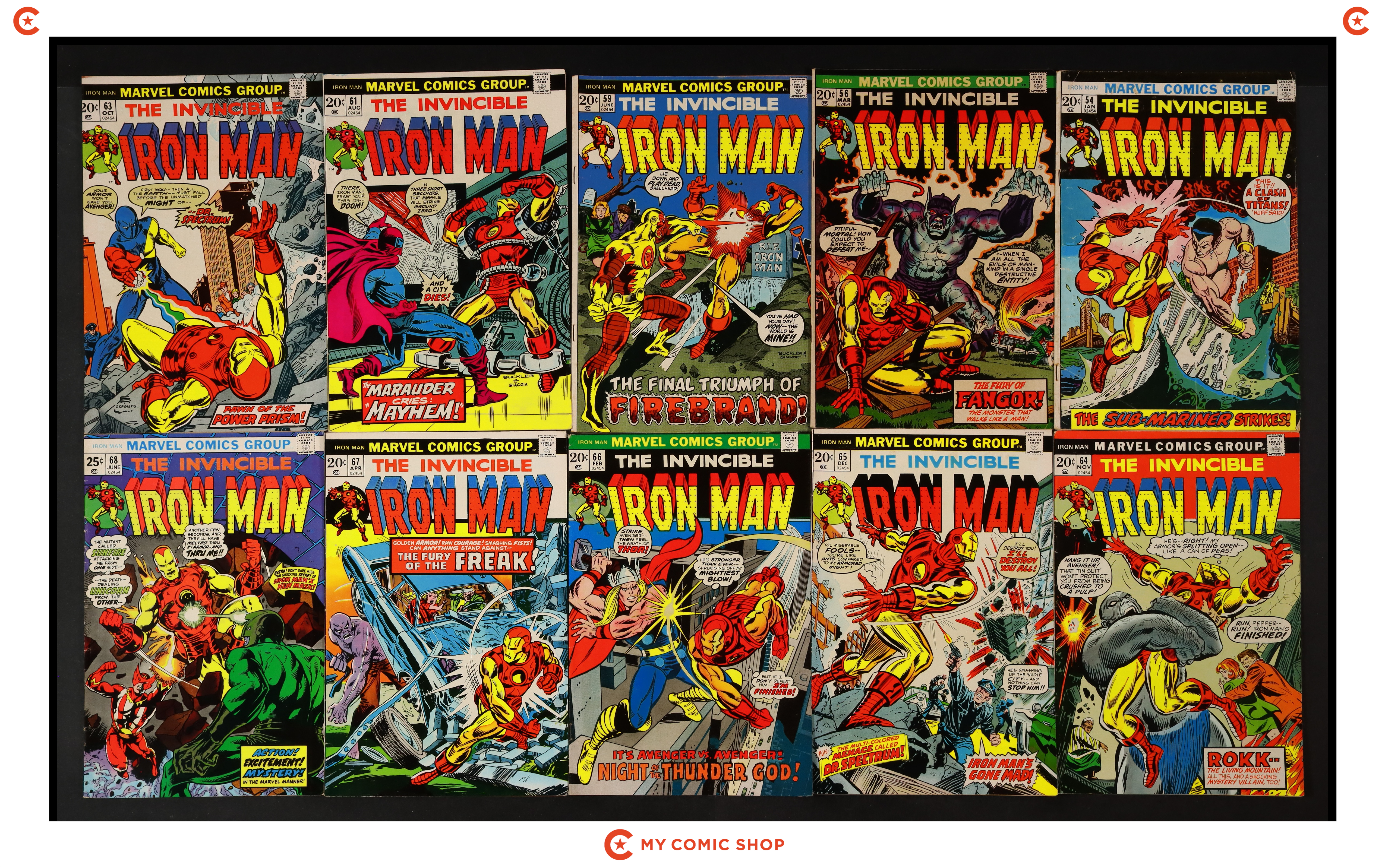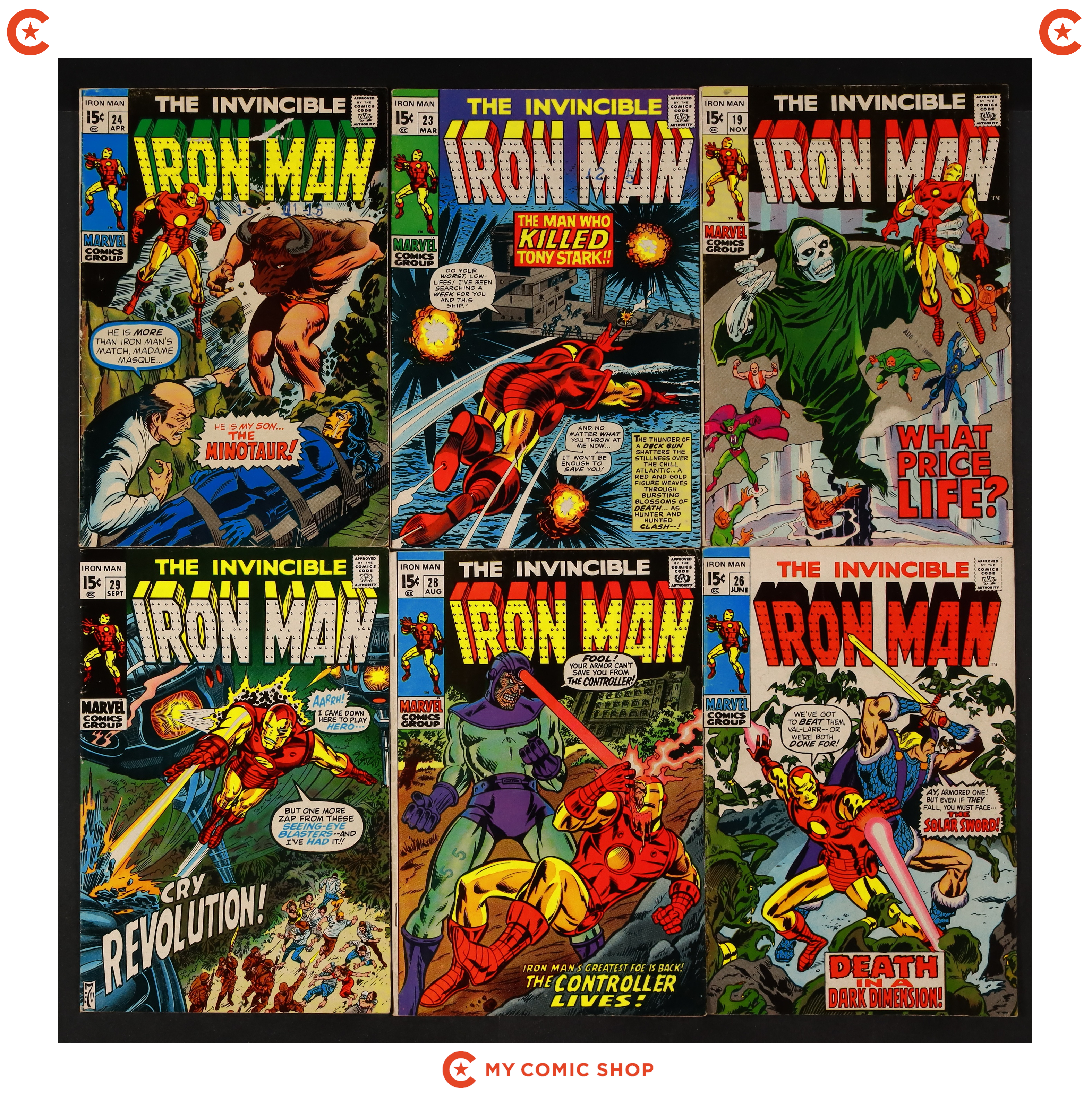 Issues 19, 23, 24, 26, 28, 29, 37, 40, 43, 46, 48, 53 of Iron Man (1968 1st Series). Most will grade in the GD/VG to VG/FN range.