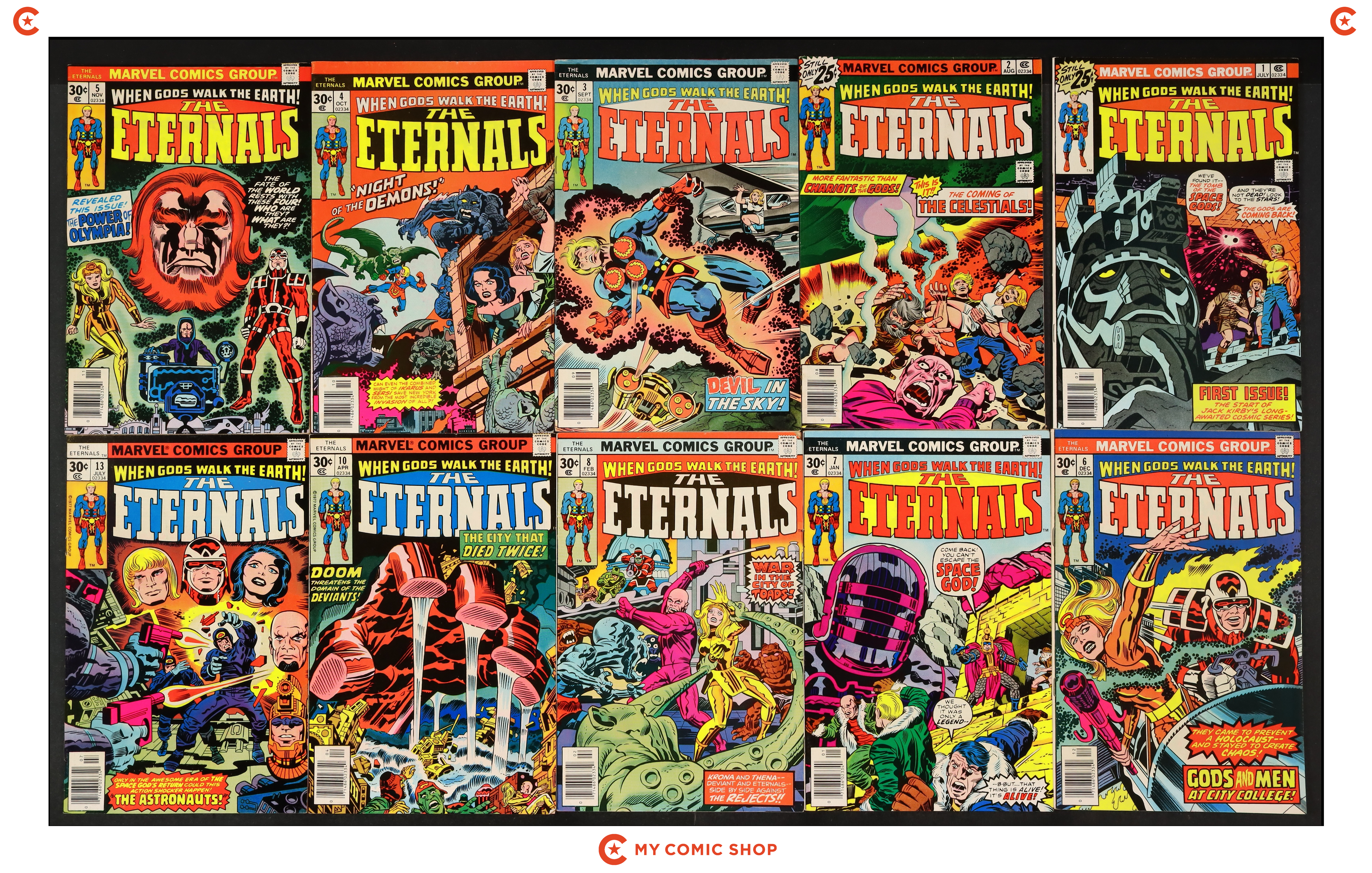 Issues 1-8, 10, and 13 of Eternals (1976 1st Series). Most will grade in the FN to VF range.