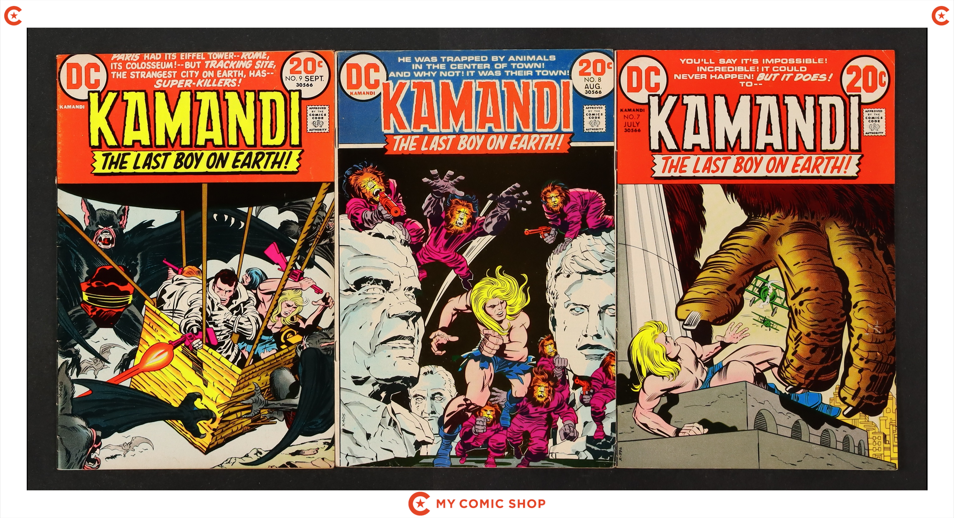 Issues 1-9 of Kamandi (1972 DC). Most will grade in the GD/VG to VG/FN range, with #1 grading at GD.