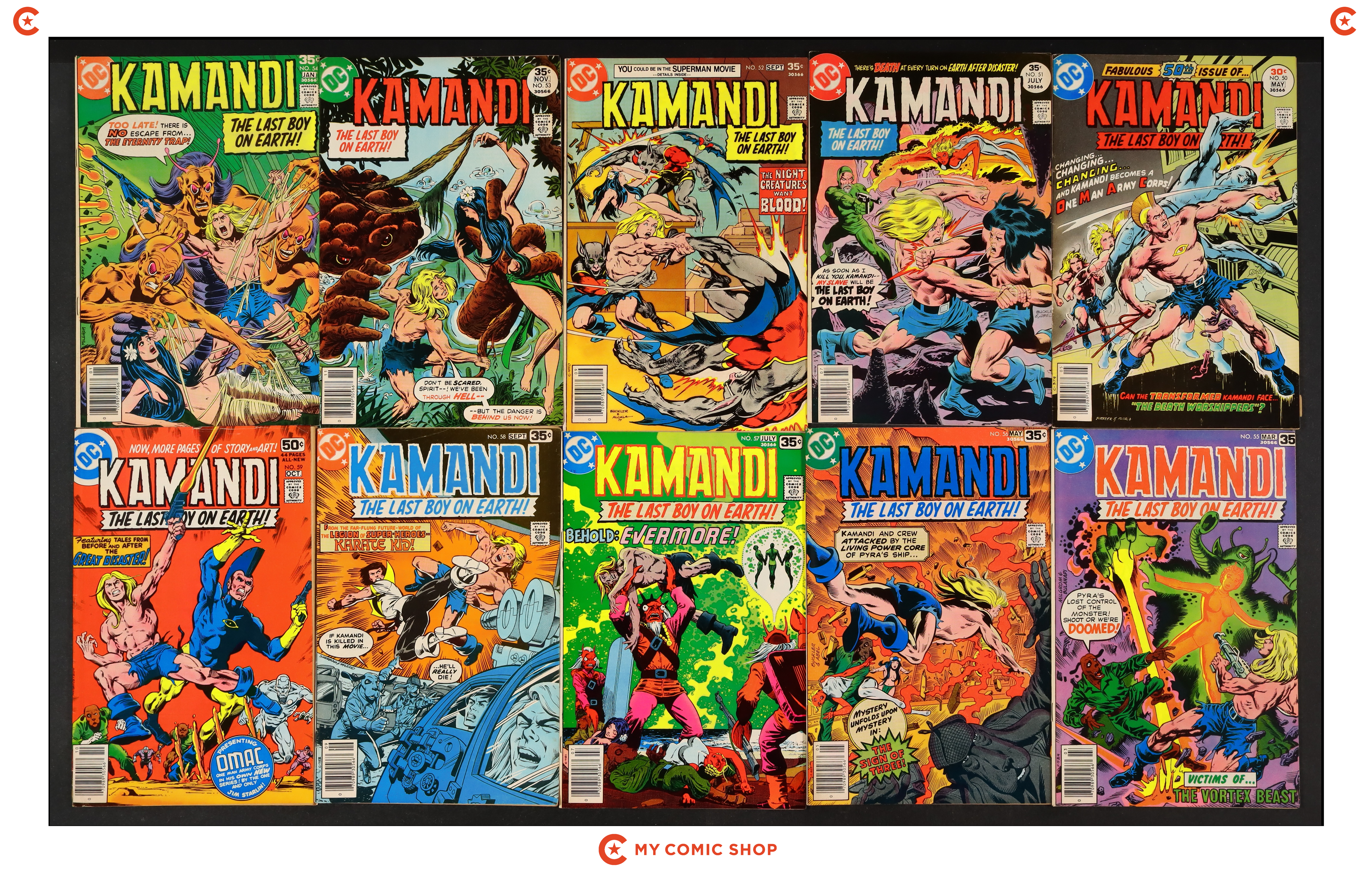 Issues 50-59 of Kamandi (1972 DC). Most will grade in the VG to FN range.