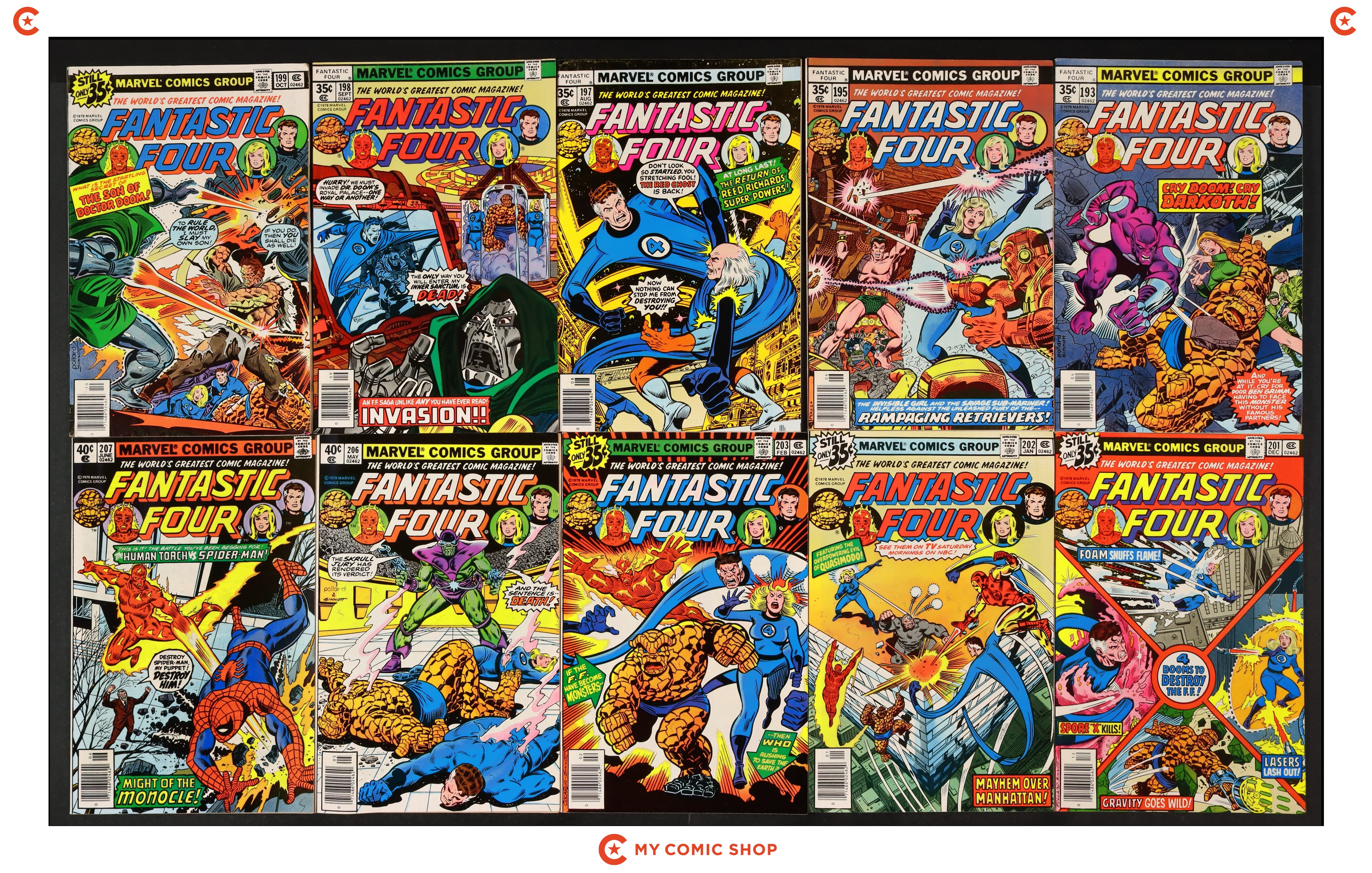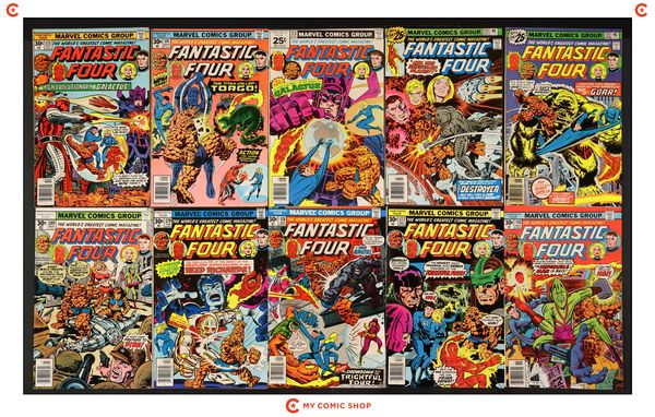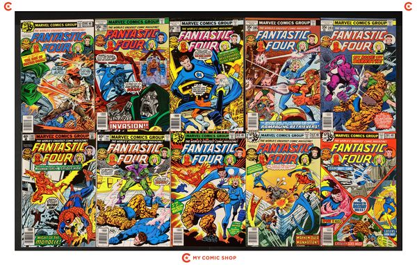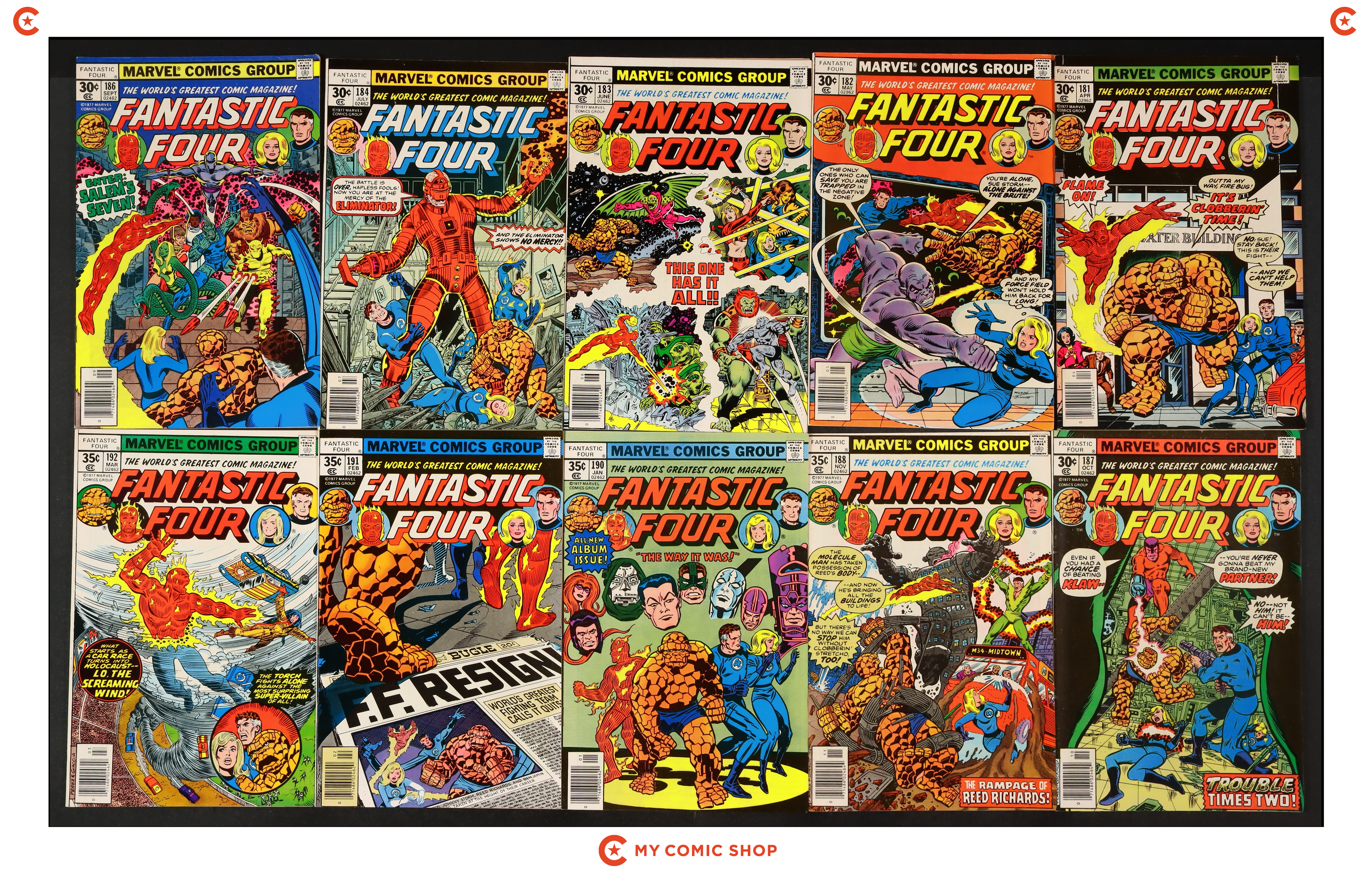 Issues 181, 182, 183, 184, 186, 187, 188, 190, 191, and 192 of Fantastic Four (1961 1st Series). Most will grade in the VG to FN range.