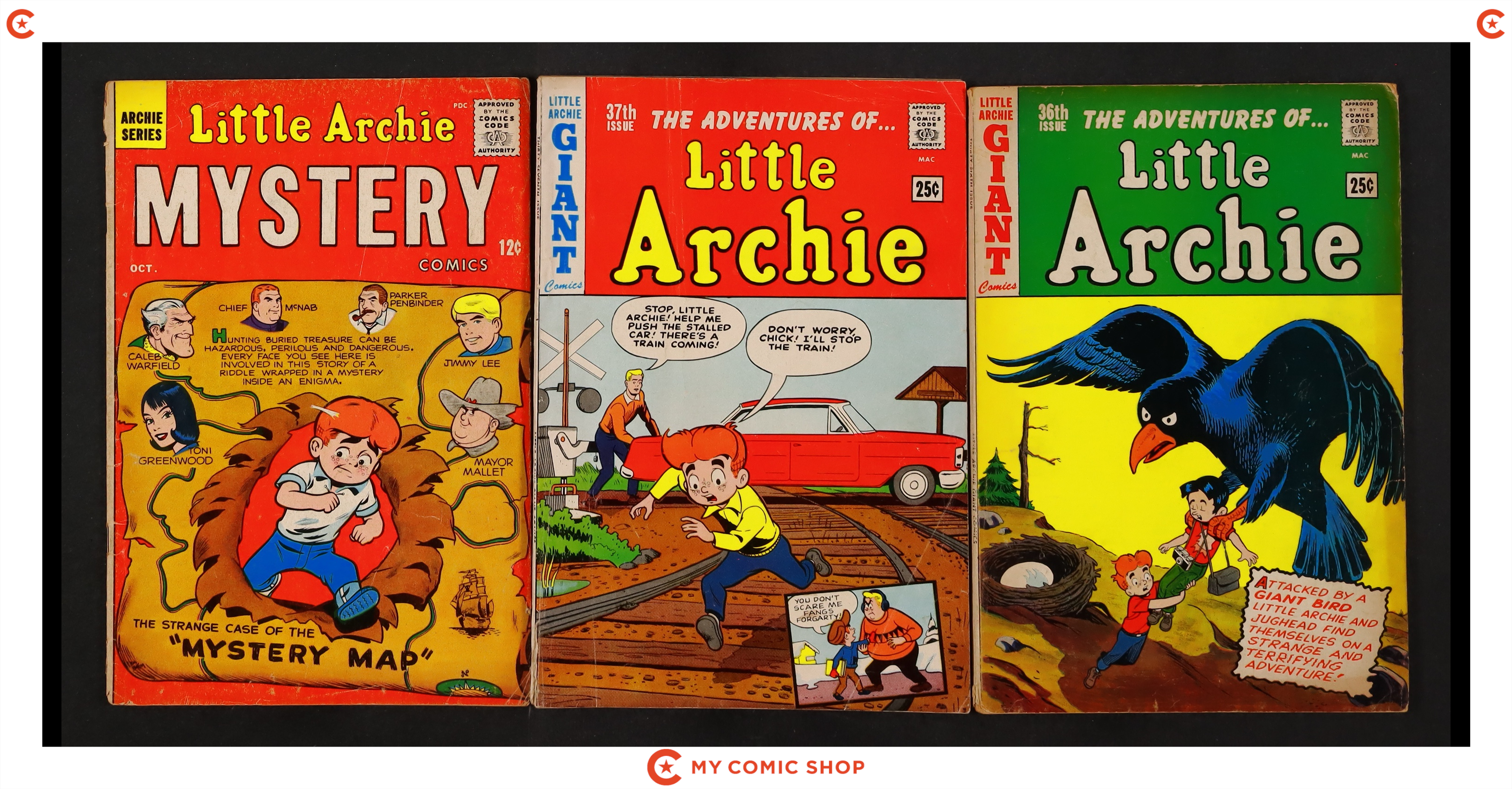 Issues 10, 14, 28, 31, 36, and 37 of Little Archie (1956); and 2 of Little Archie Mystery (1963). Most will grade in the VG range with a couple grading GD.
