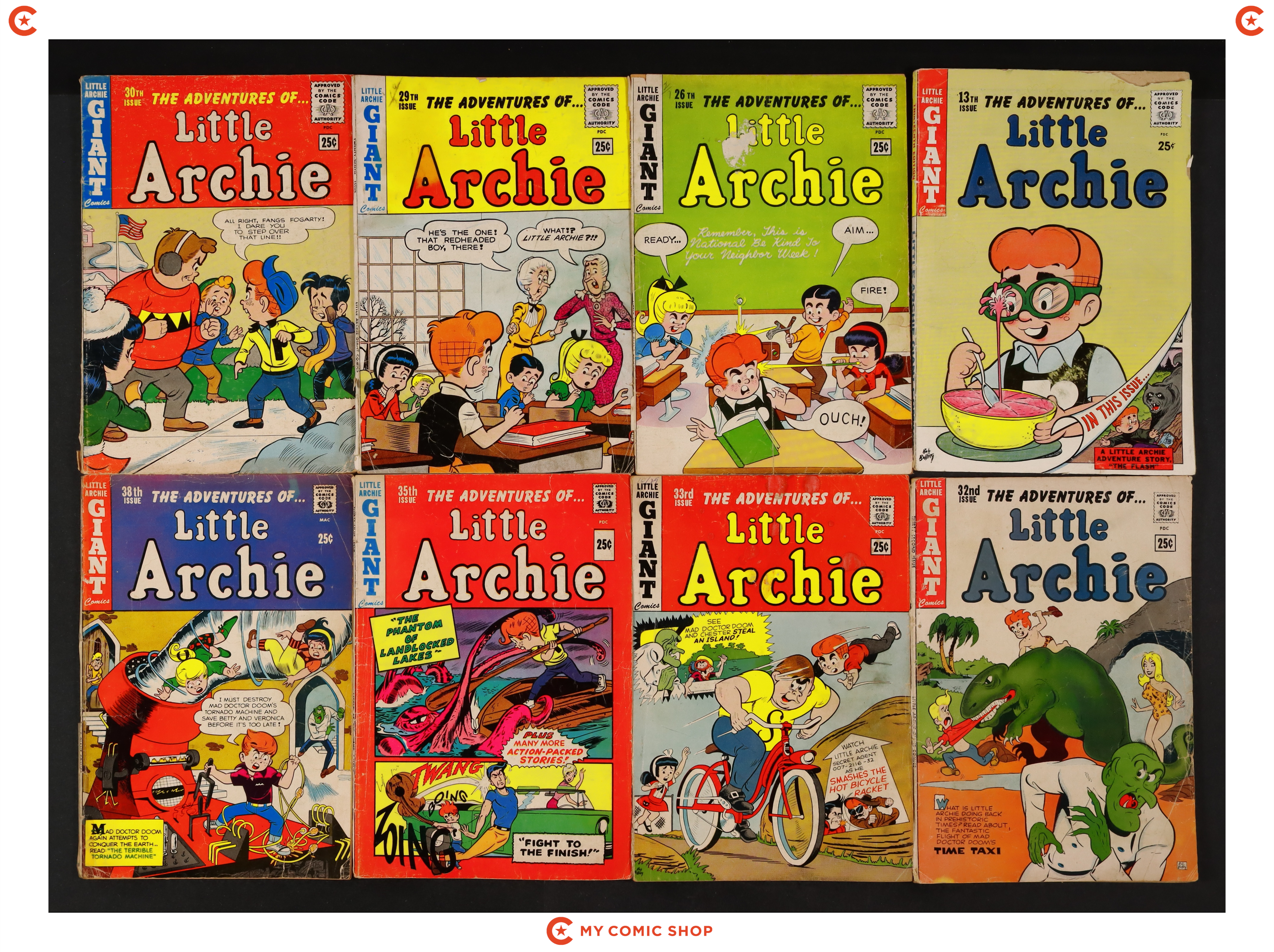 Issues 13, 26, 29, 30, 32, 33, 35, and 38 of Little Archie (1956). Most will grade in the GD range.