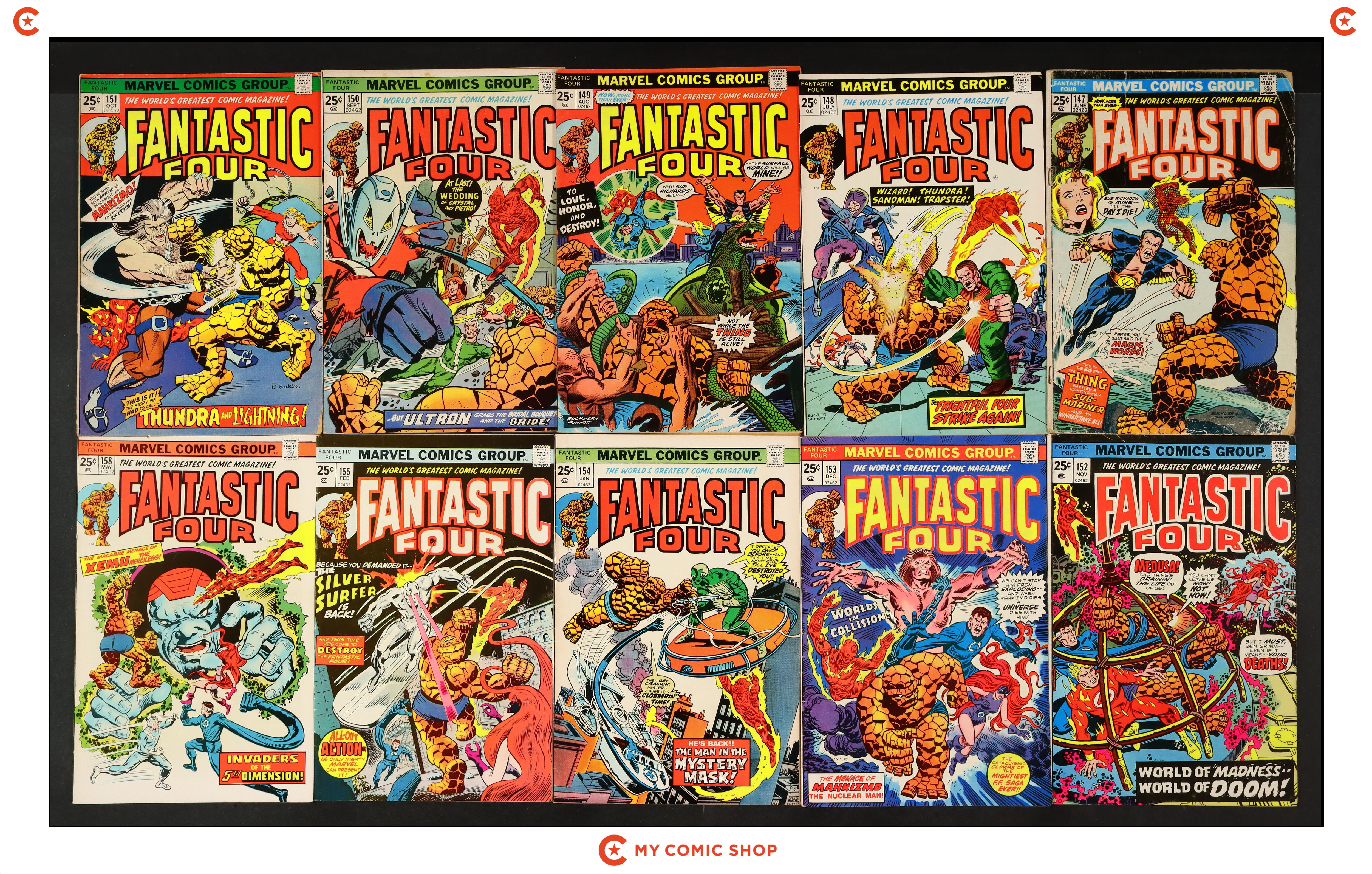 Issues 147, 148, 149, 150, 151, 152, 153, 154, 155, and 158 of Fantastic Four (1961 1st Series). Most will grade in the VG to FN range with #147 grading FR/GD and #151 grading FR.