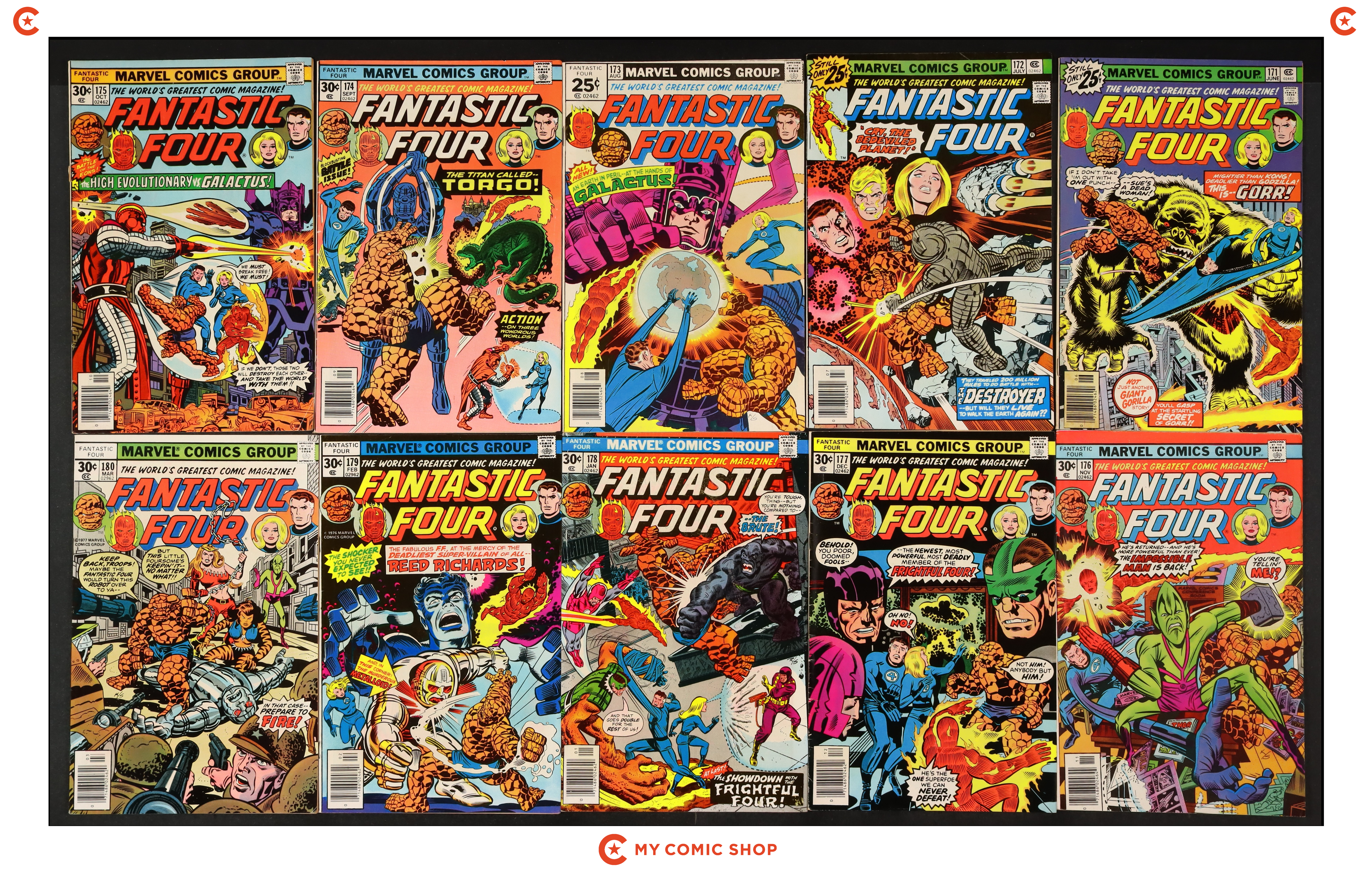 Issues 171, 172, 173, 174, 175, 176, 177, 178, 179, and 180 of Fantastic Four (1961 1st Series). Most will grade in the VG to FN range.