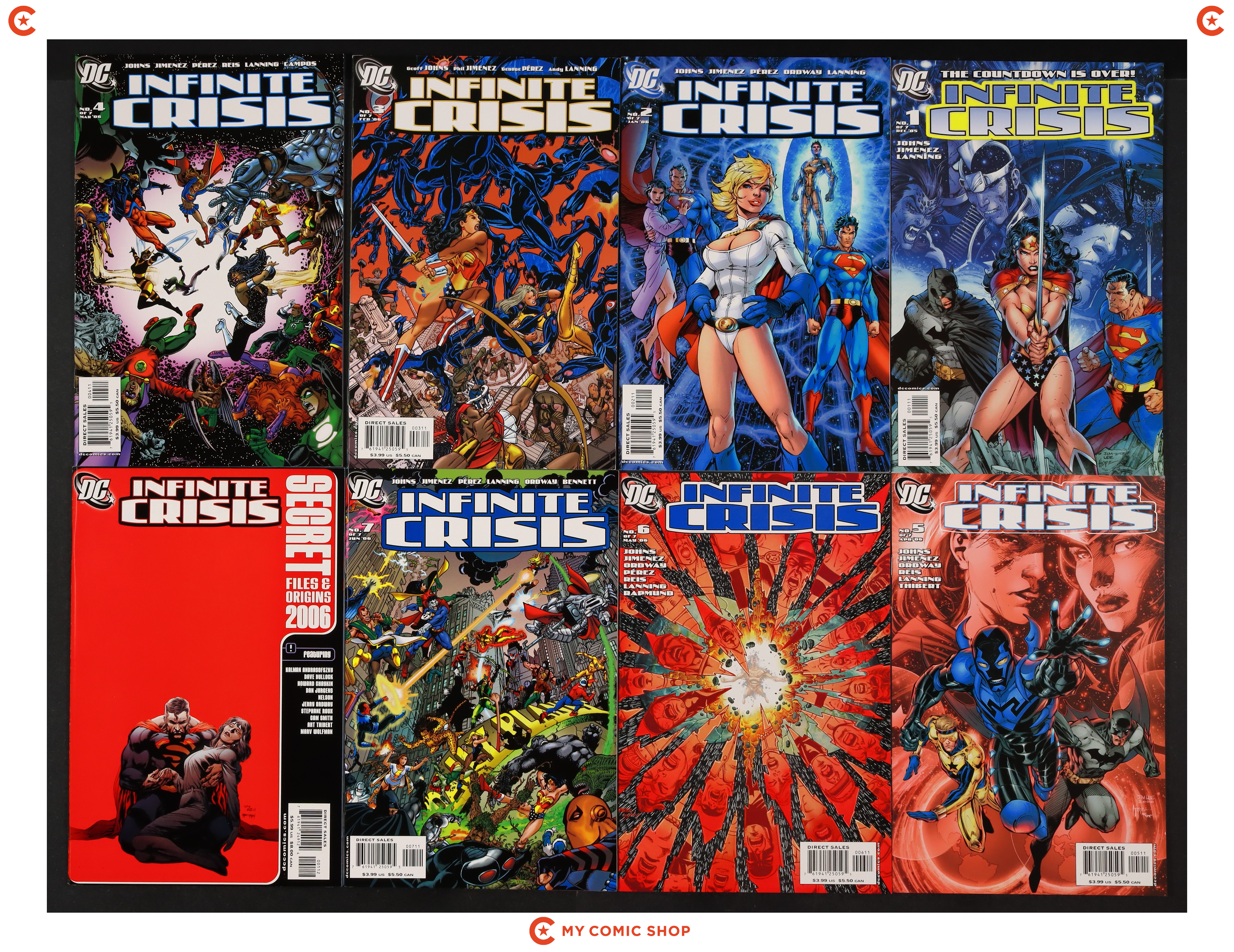 Issues 1A, 2A, 3B, 4B, 5A, 6B, and 7B of Infinite Crisis (2005); and 2006B of Infinite Crisis Secret Files (2006). Most will grade in the VF range with a few grading NM.