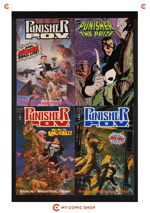 Issues 1 of Punisher The Prize (1990); 1-4 of Punisher POV (1991); 1-1ST of Punisher G-Force GN (1992 Marvel); and 1 of Punisher Batman Deadly Knights (1994). Most will grade in the FN/VF to FN range.