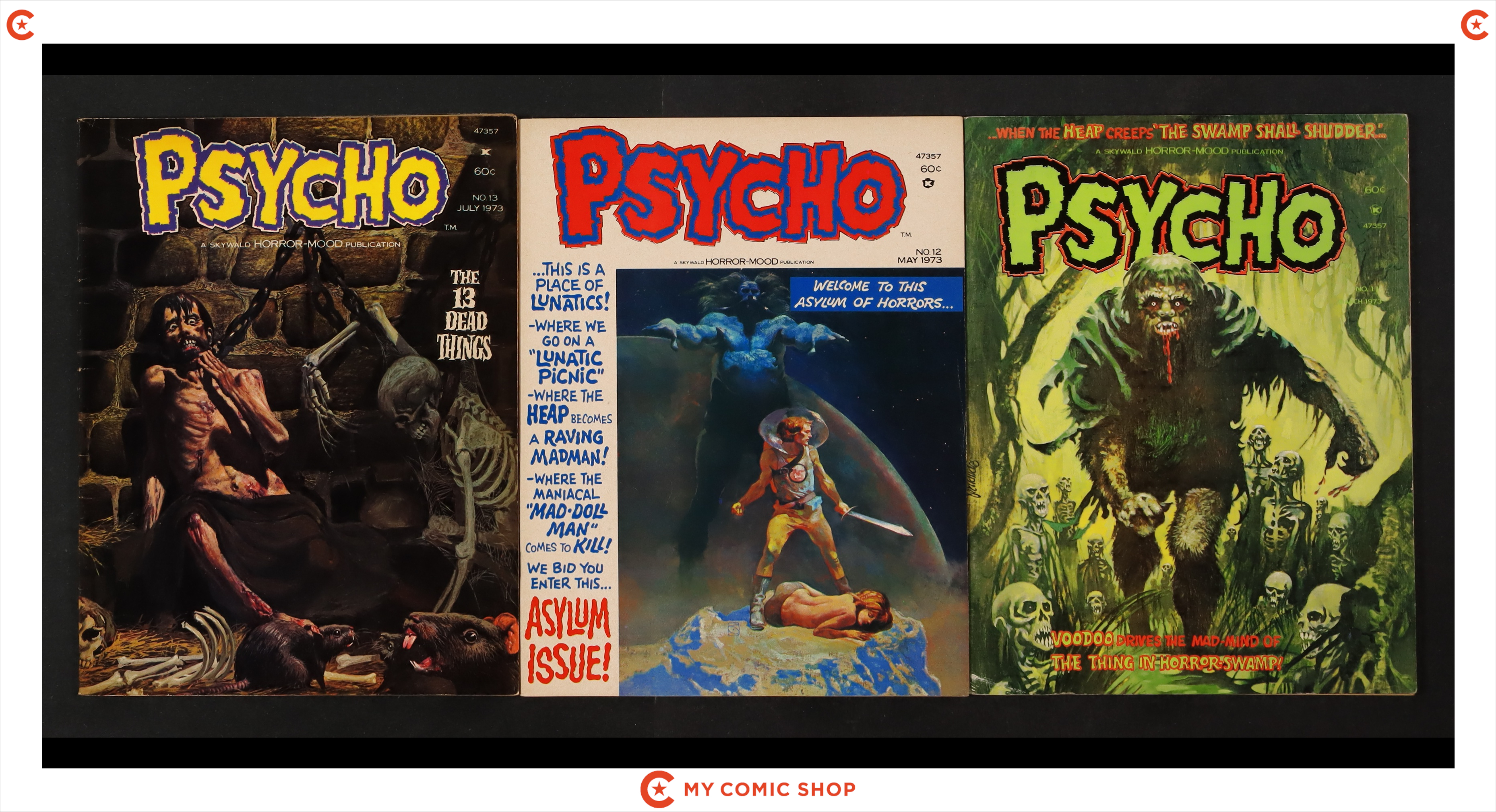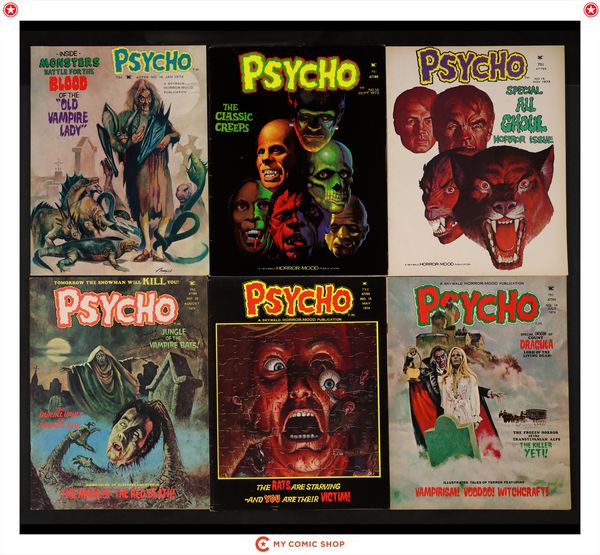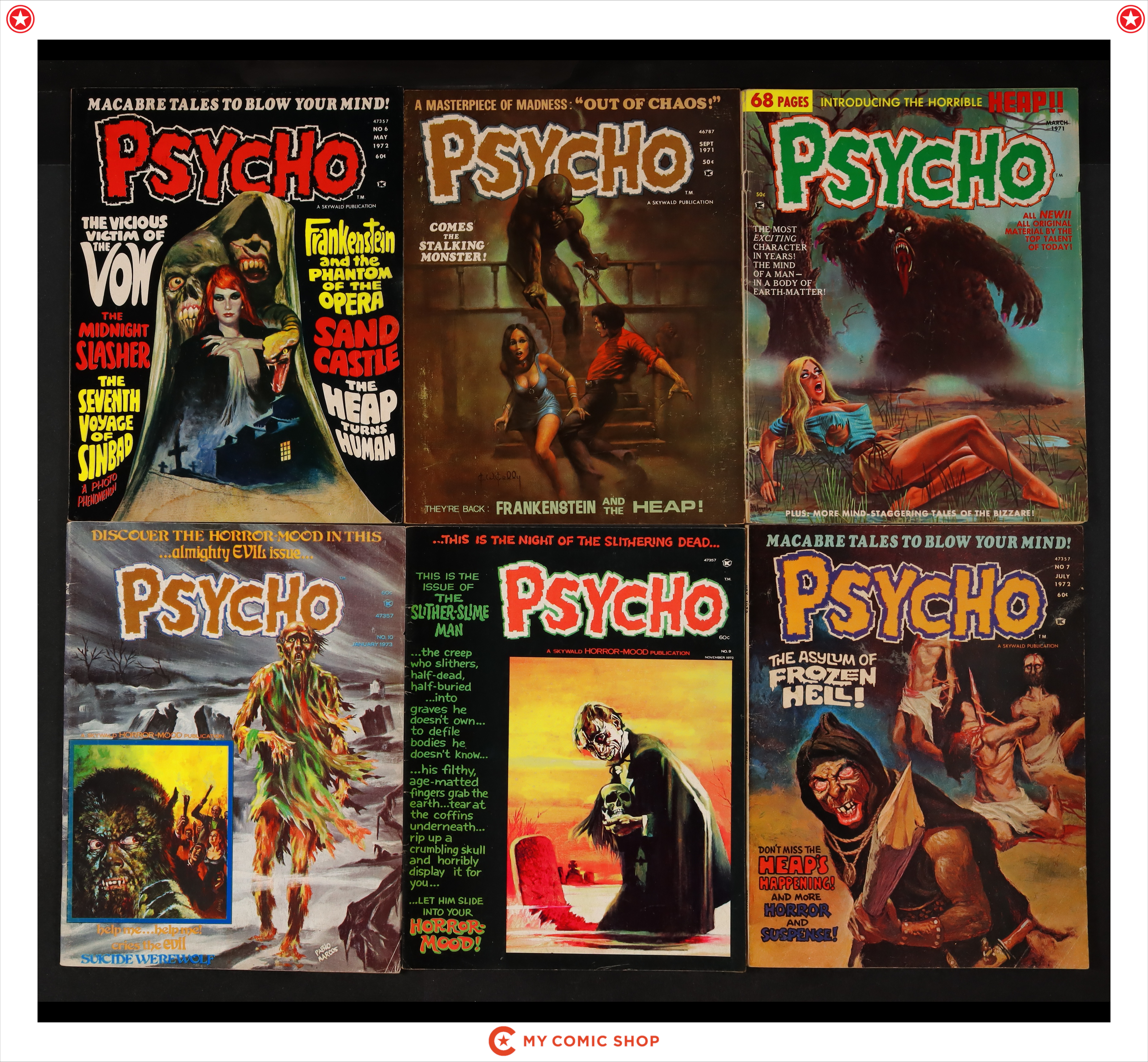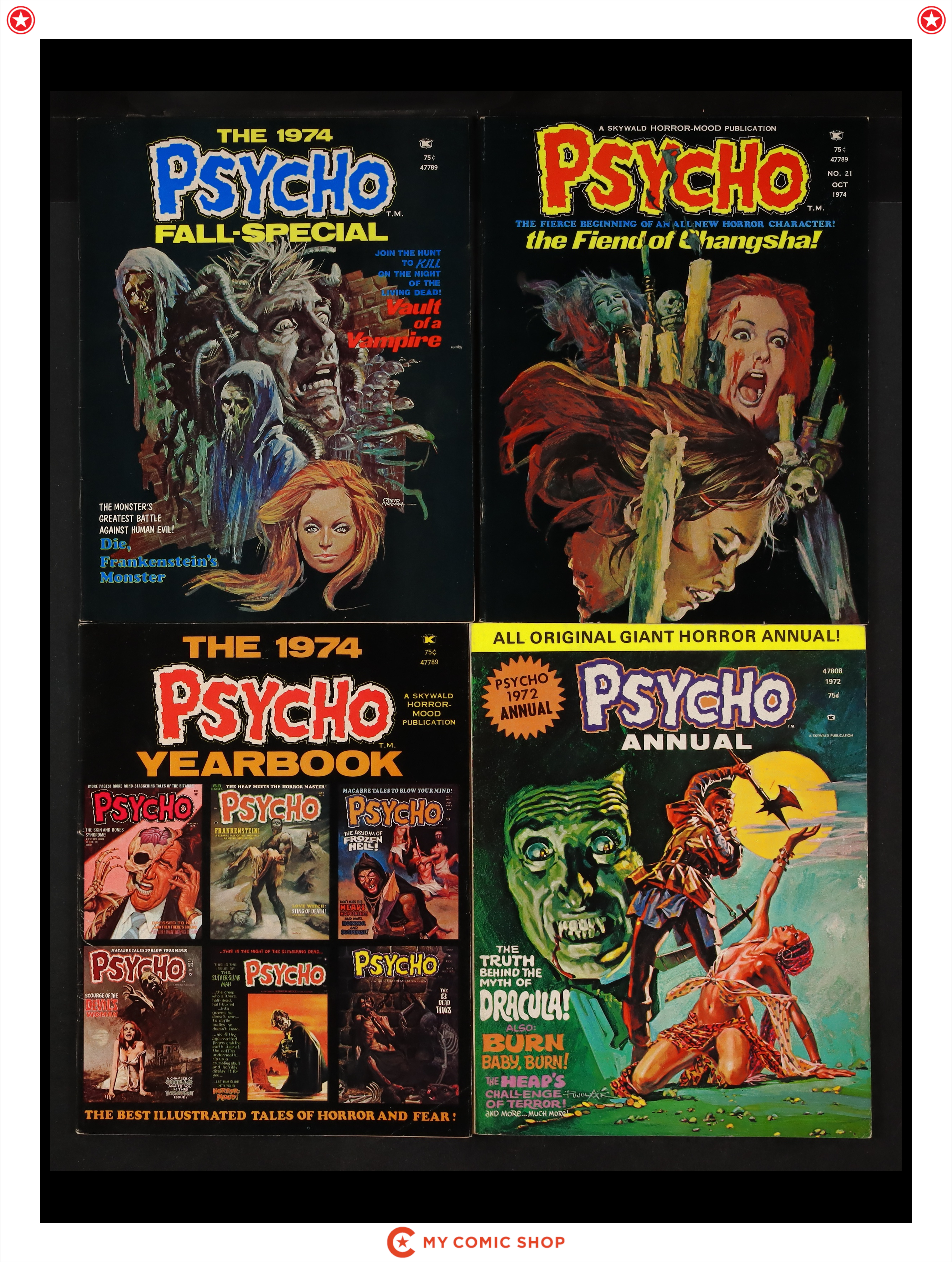 Issues 14-16, 18-21, and 22 of Psycho (1971-1975 Skywald); 1 of Psycho (1972 Magazine) Annual; and 0 of Psycho (Magazine) Yearbook. Most will grade in the FN range with a few grading VG.