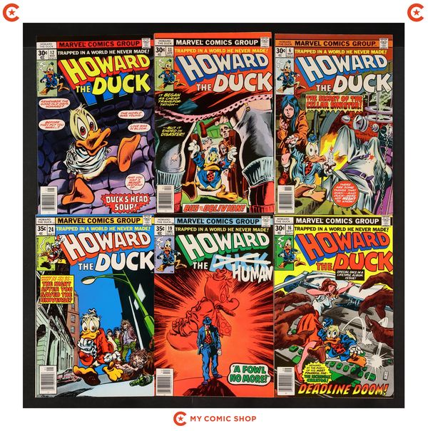 Issues 5-8, 10, 27, 28, and 30 of Howard the Duck (1976 1st Series); and 1 of Howard the Duck (1976 1st Series) Annual. Most will grade in the FN range with a few grading VF.
