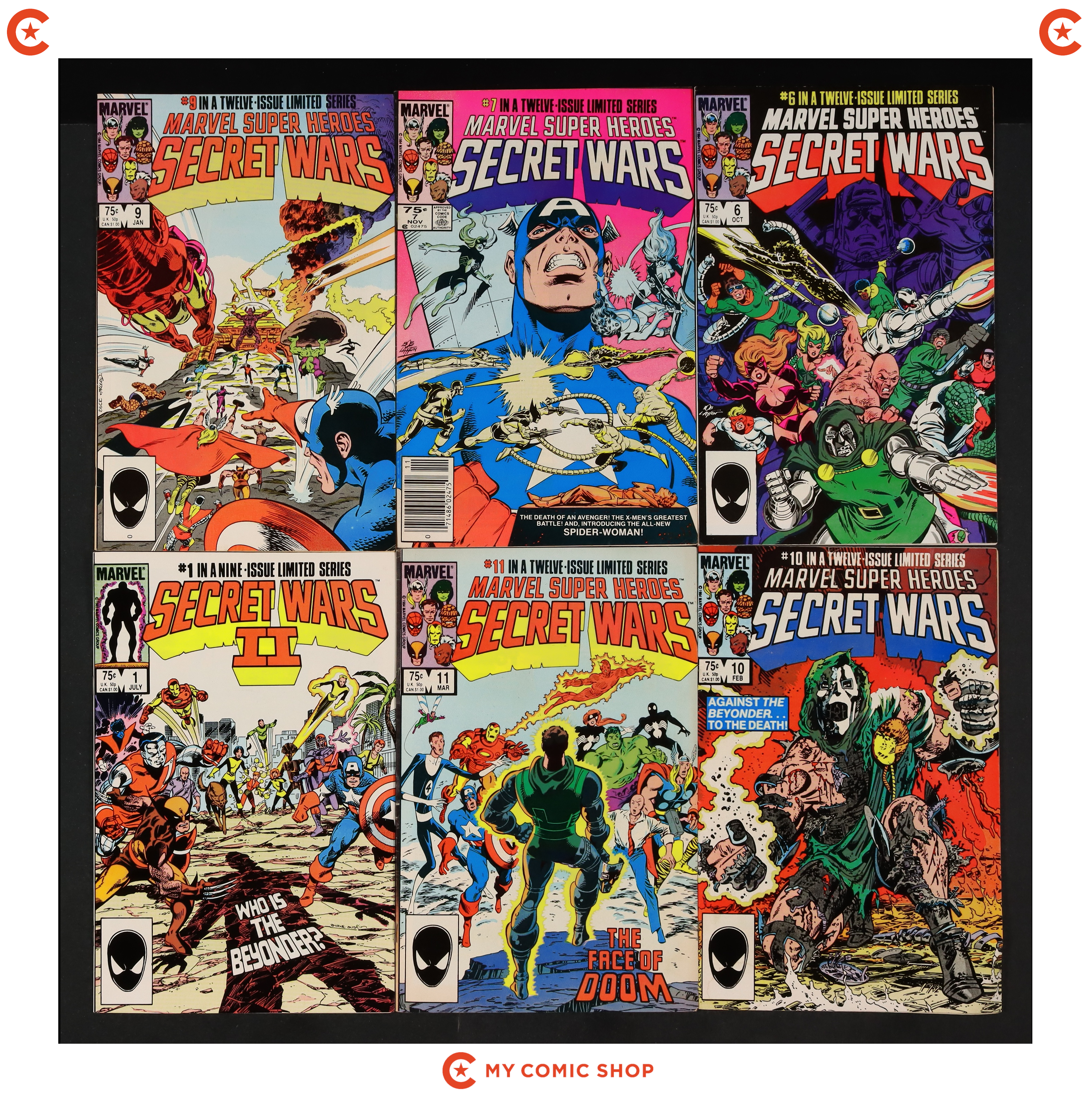 Issues 6D, 7N, 9D-11D of Marvel Super Heroes Secret Wars (1984); and 1D, 2N, 6, 7 of Secret Wars II (1985 Marvel). Most will grade in the FN- to VF range, with 10 grading at GD/VG.