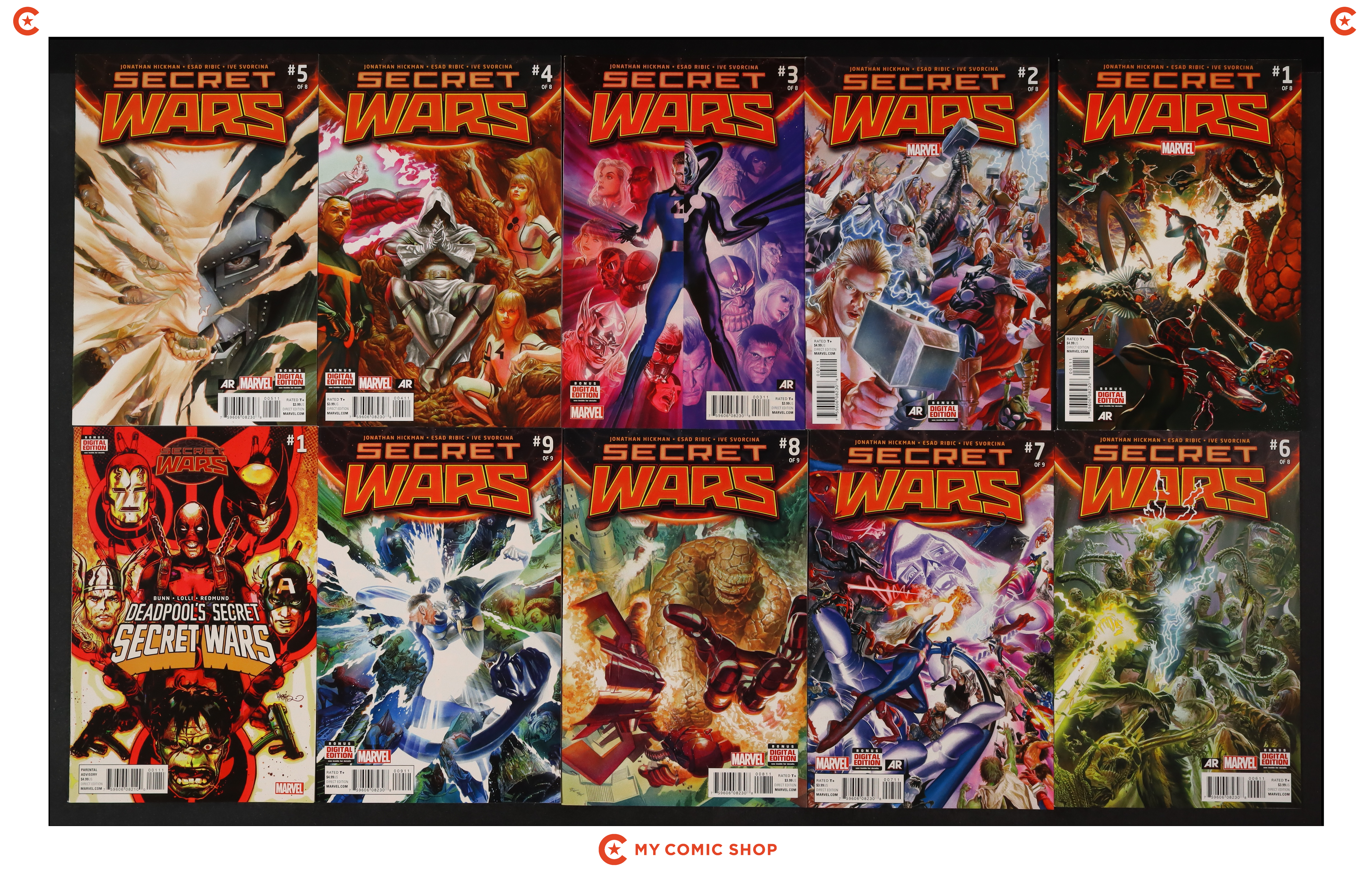 Issues 1A, 2A, 3A, 4A, 5A, 6A, 7A, 8A, 9A of Secret Wars (2015 3rd Series), and issues 1A, 2A, 3A, 4A of Deadpool's Secret Secret Wars (2015). Most will grade in the VF to NM range with #2 of Secret Wars (2015 3rd Series) grading VG.