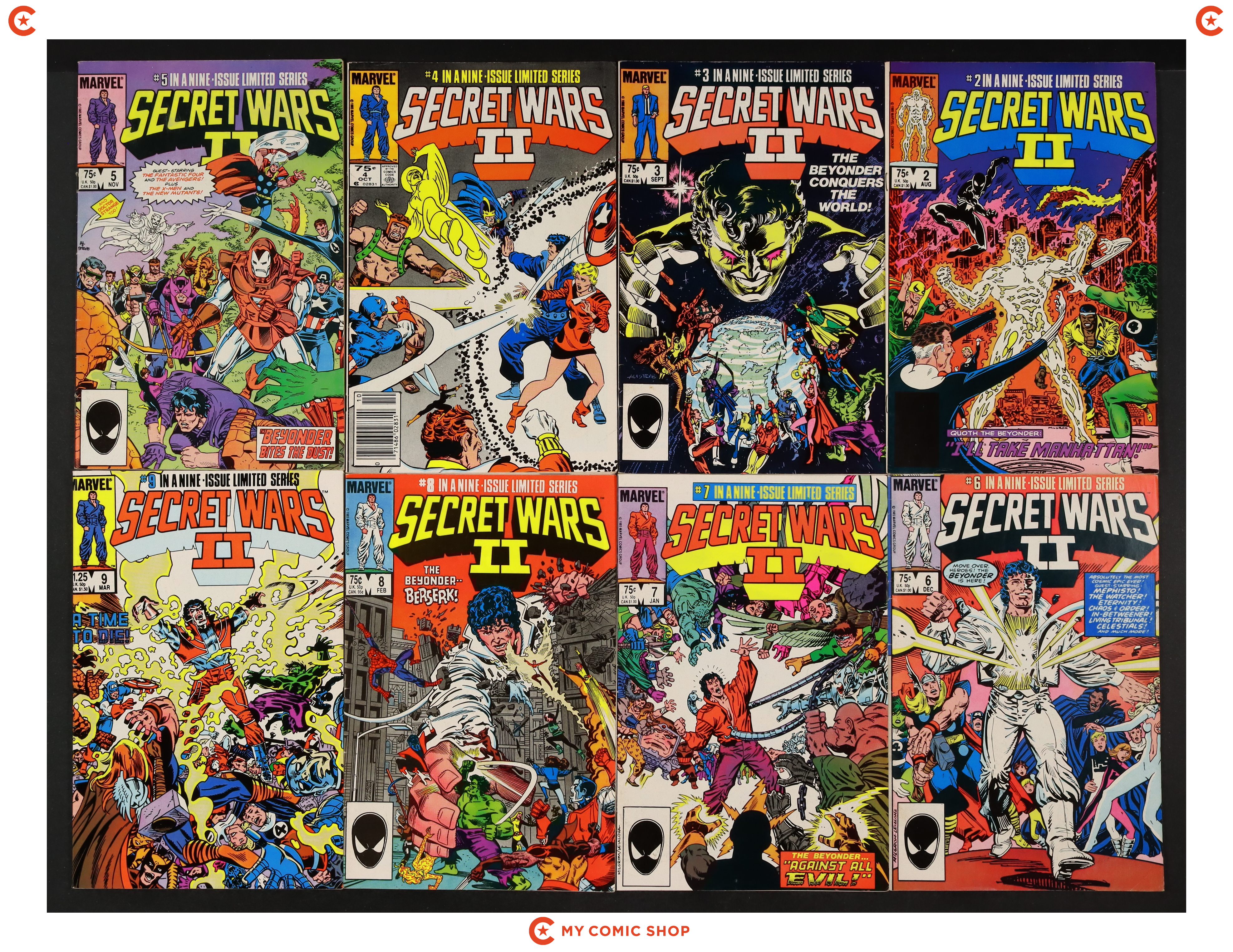 Issues 1D, 2D, 3N, 4-9 of Secret Wars II (1985 Marvel); and Marvel Super Heroes Secret Wars (1984) 9D. Most will grade in the FN to FN/VF range, with 3 grading at GD/VG.