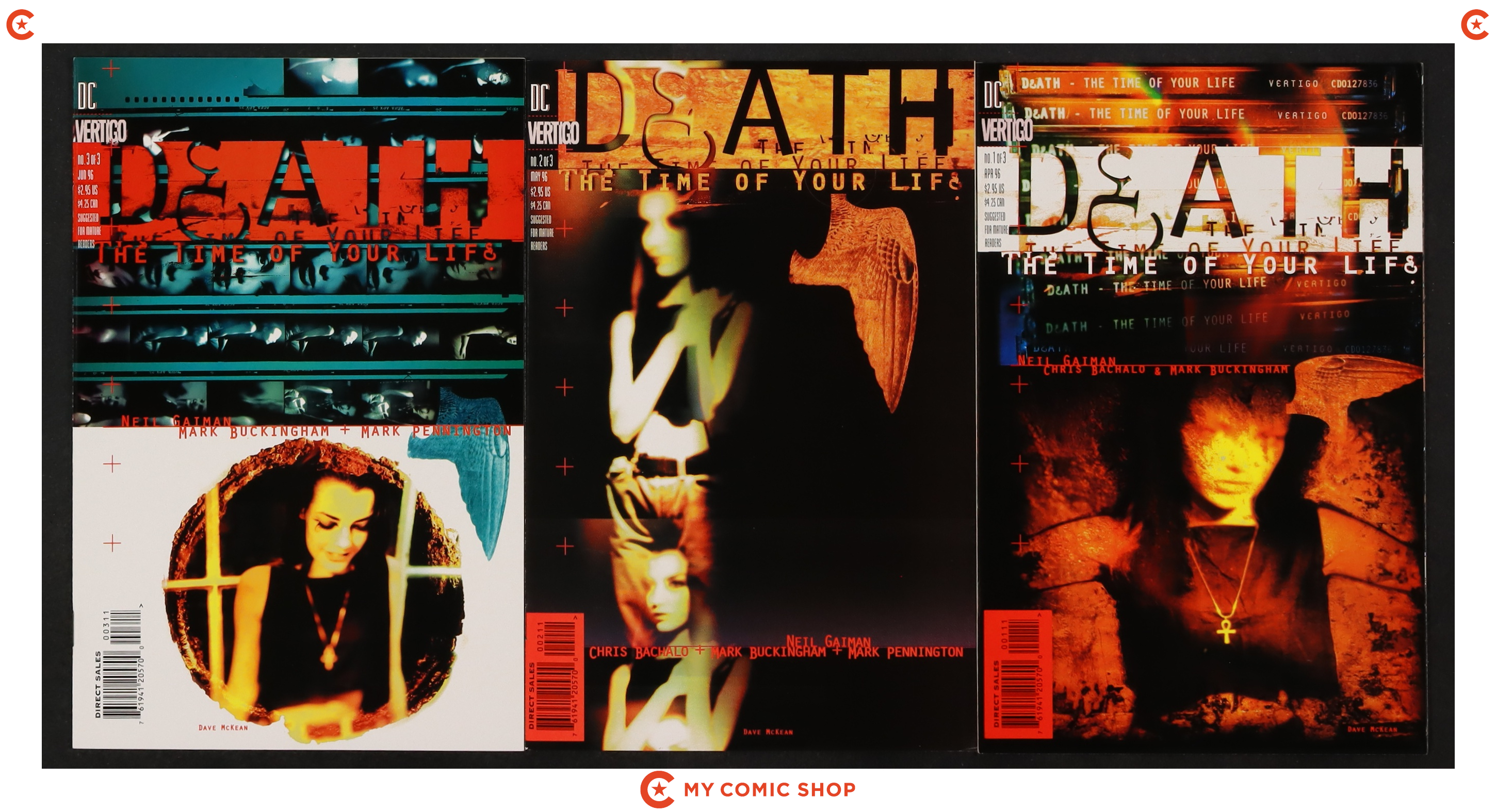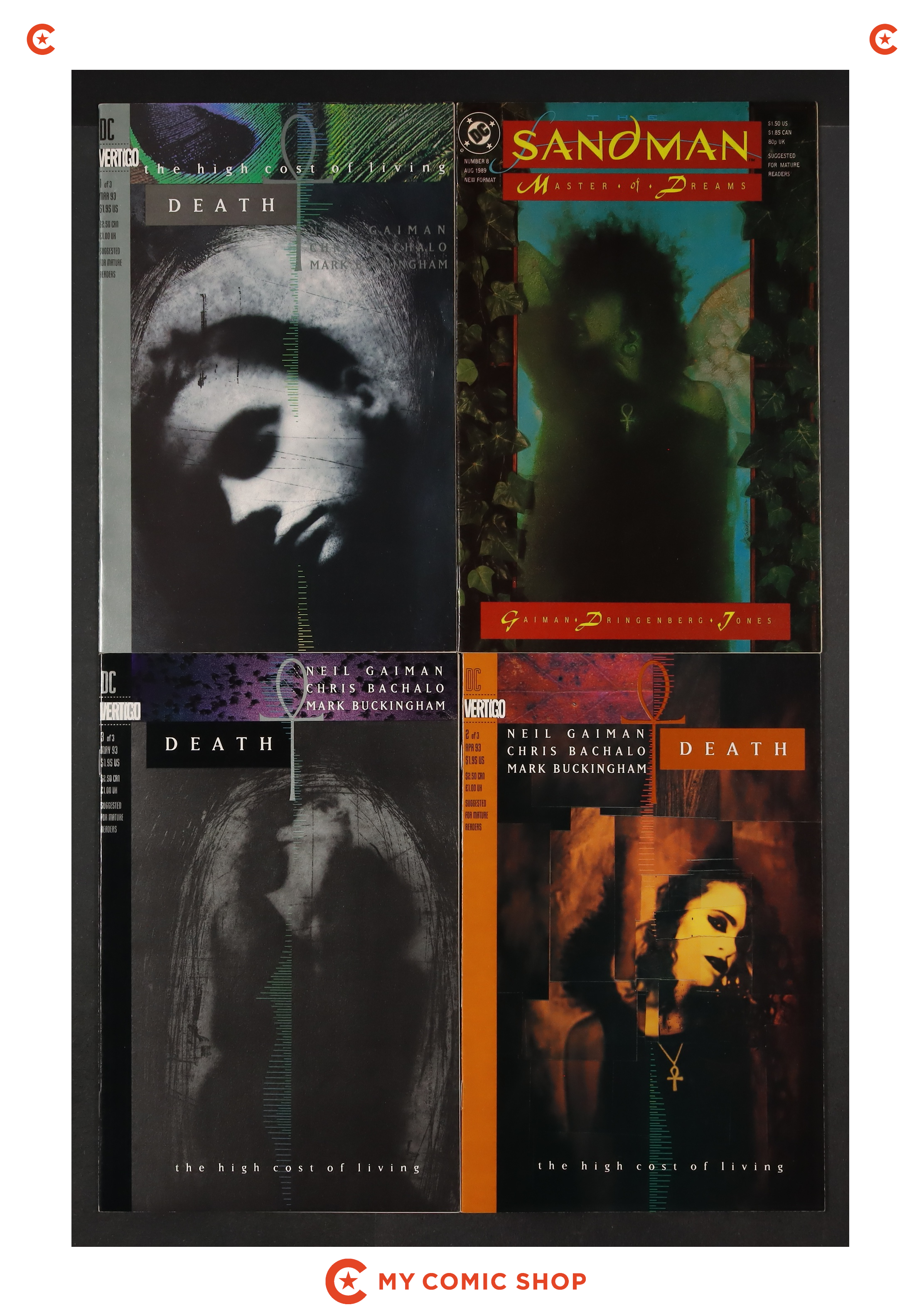 Issue 8A of Sandman (1989 DC/Vertigo), issues 1A, 2, 3A of Death The High Cost of Living (1993), and issues 1, 2, 3 of Death The Time of Your Life (1996). Most will grade in the FN- to VF range.