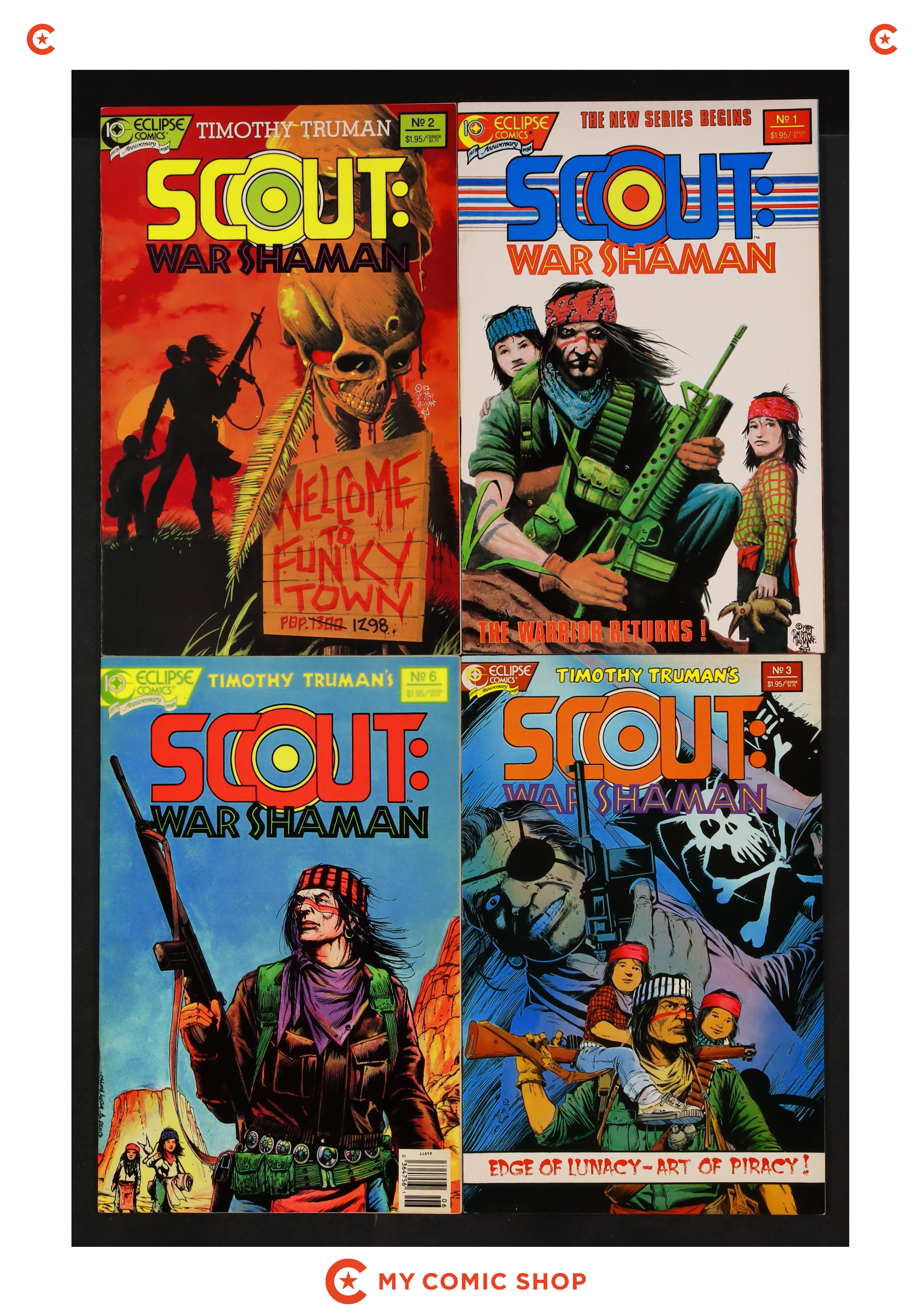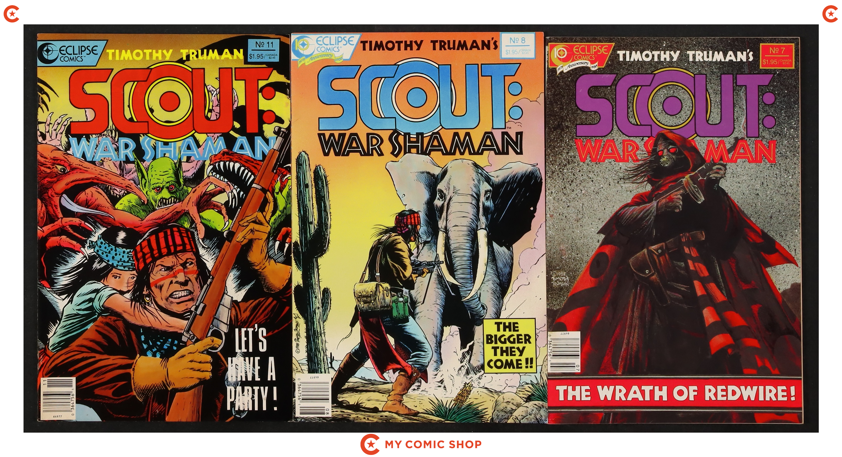Issues 1-3, 6-8, and 11 of Scout War Shaman (1988). Most will grade in the FN to VF range.