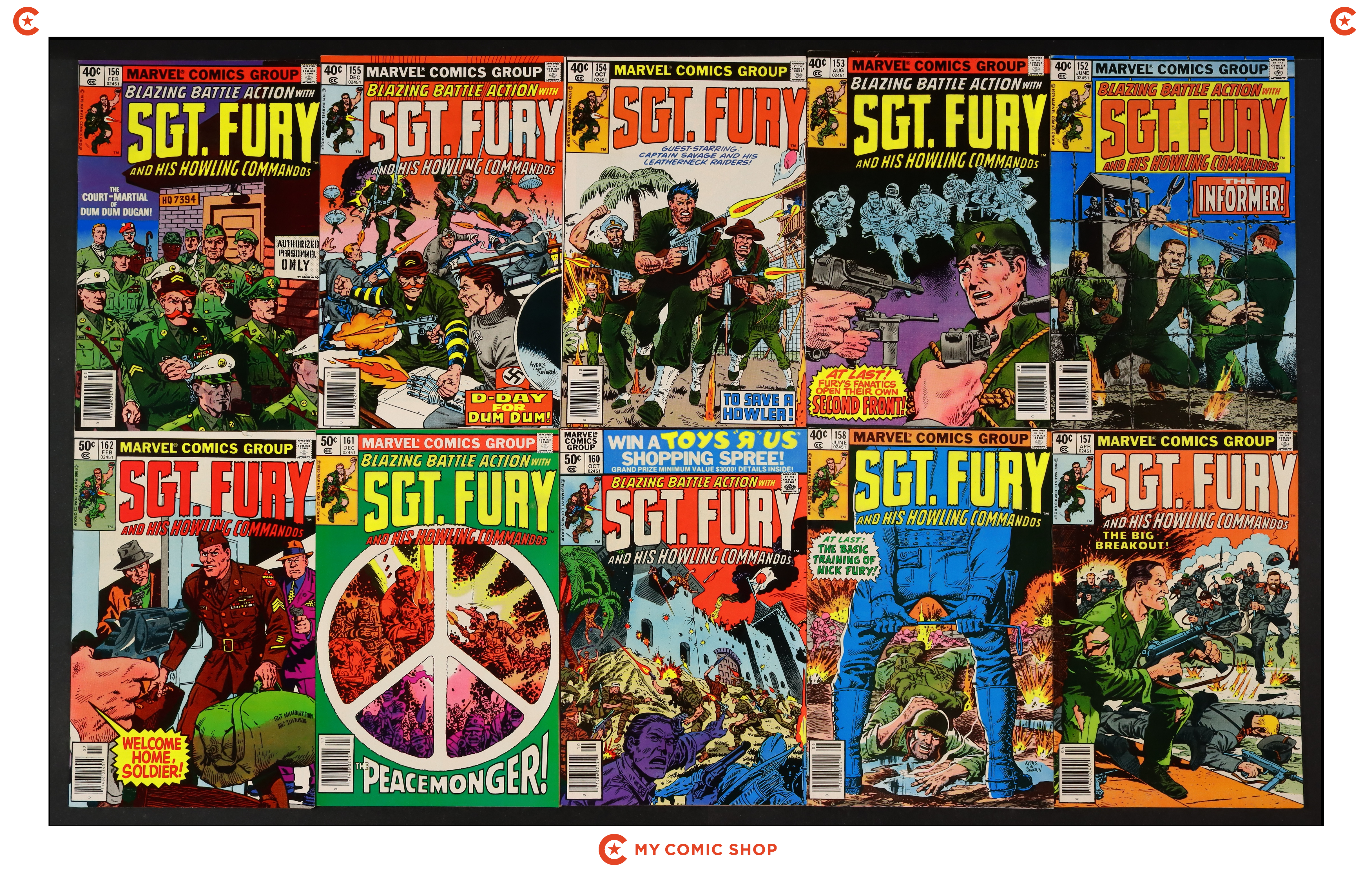 Issues 152, 153, 154, 155, 156, 157, 158, 160, 161, and 162 of Sgt. Fury (1963). Most will grade in the FN to VF range.