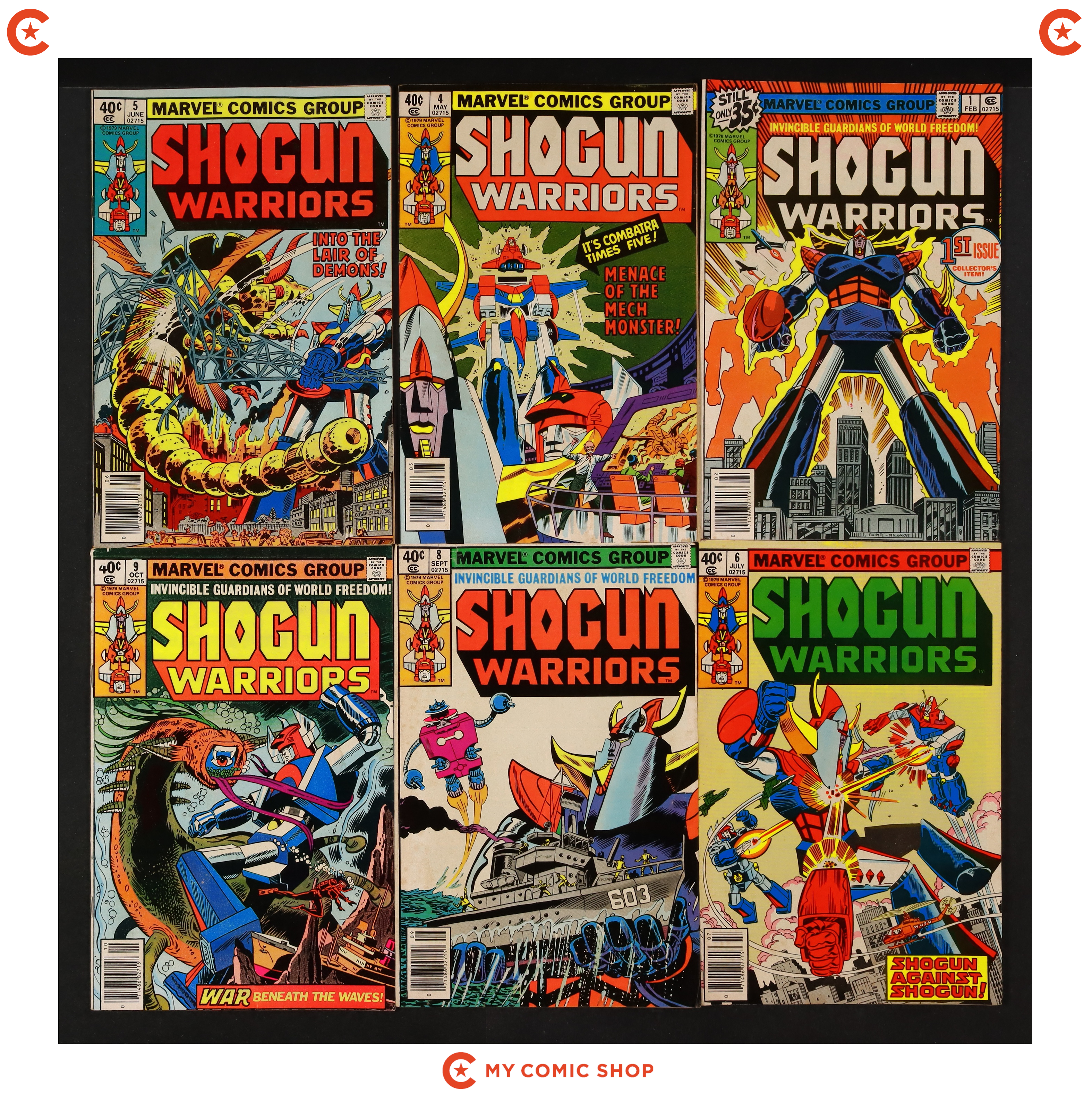 Issues 1, 4, 5, 6N, 8, and 9 of Shogun Warriors (1979). Most will grade in the VG range.