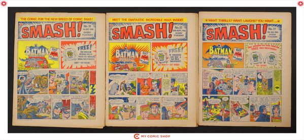 Issues 23, 24, 26, 27, 32, 35, 37, 45 of Smash! (UK 1966-1971 Odhams/IPC Magazines). Most will grade in the VG to VG/FN range.